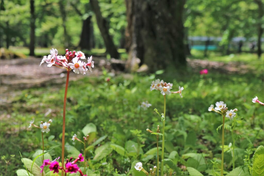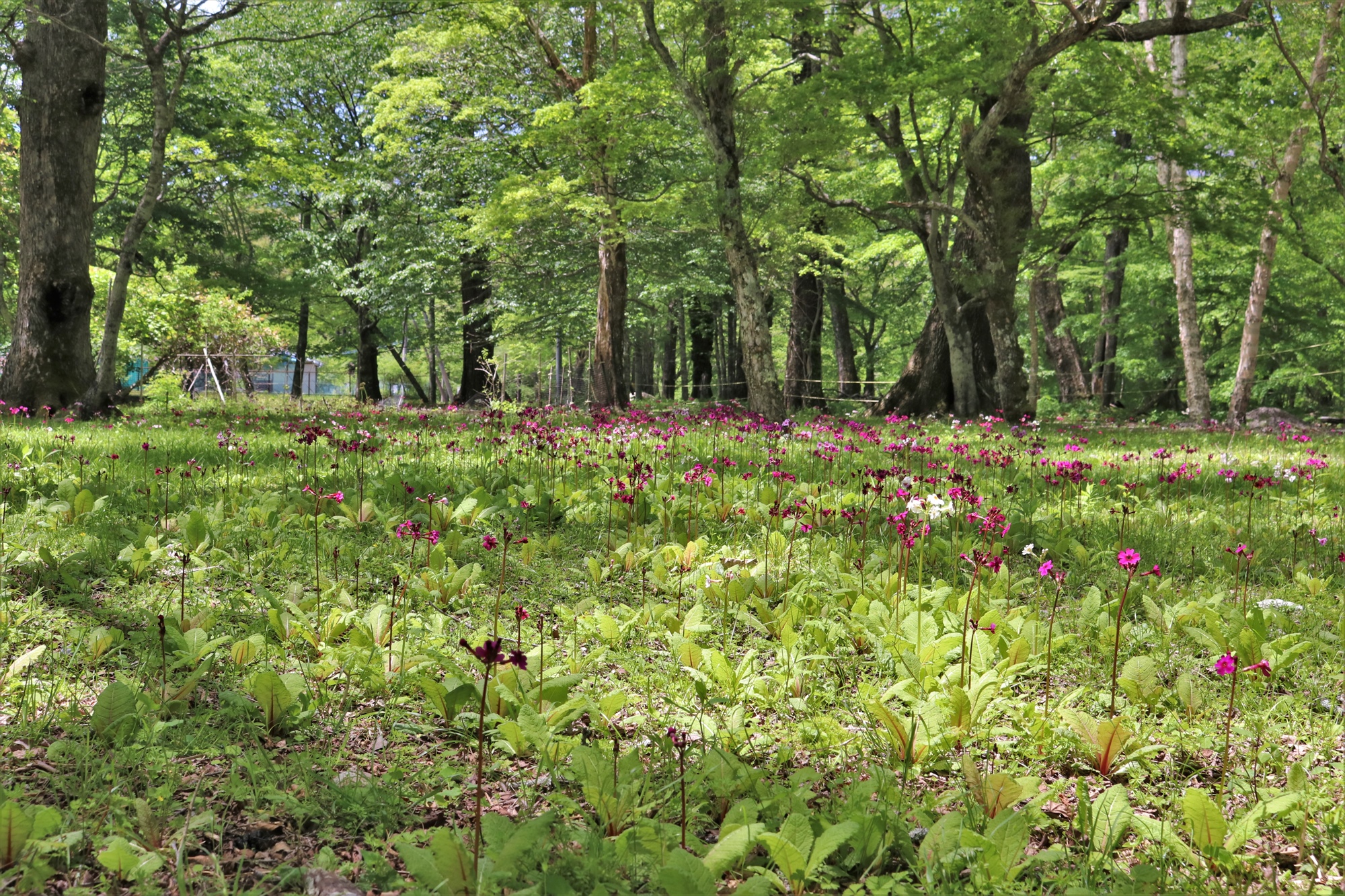 新緑で鮮やかな森の中を赤、白、ピンク色のクリンソウが彩っていました。