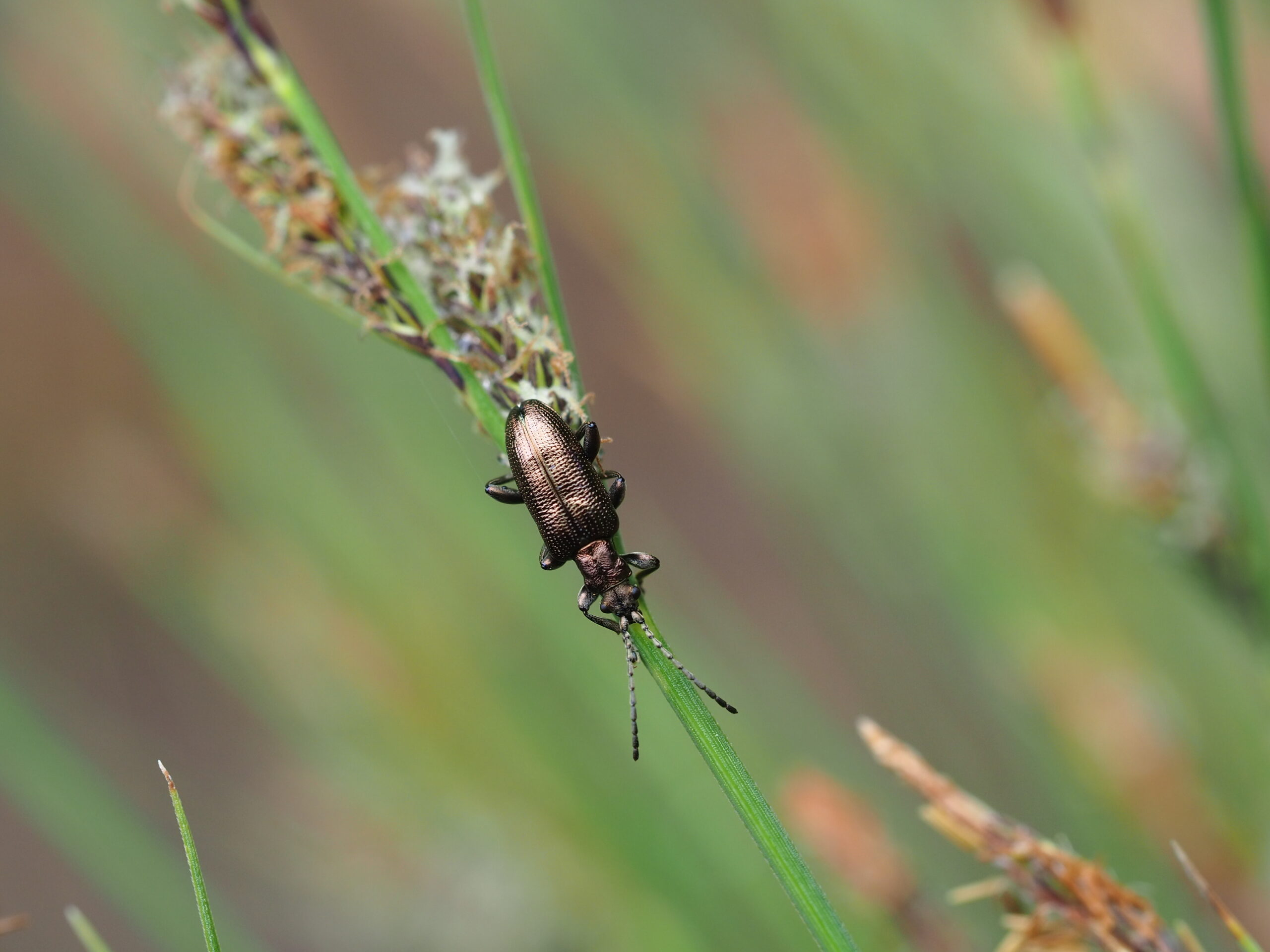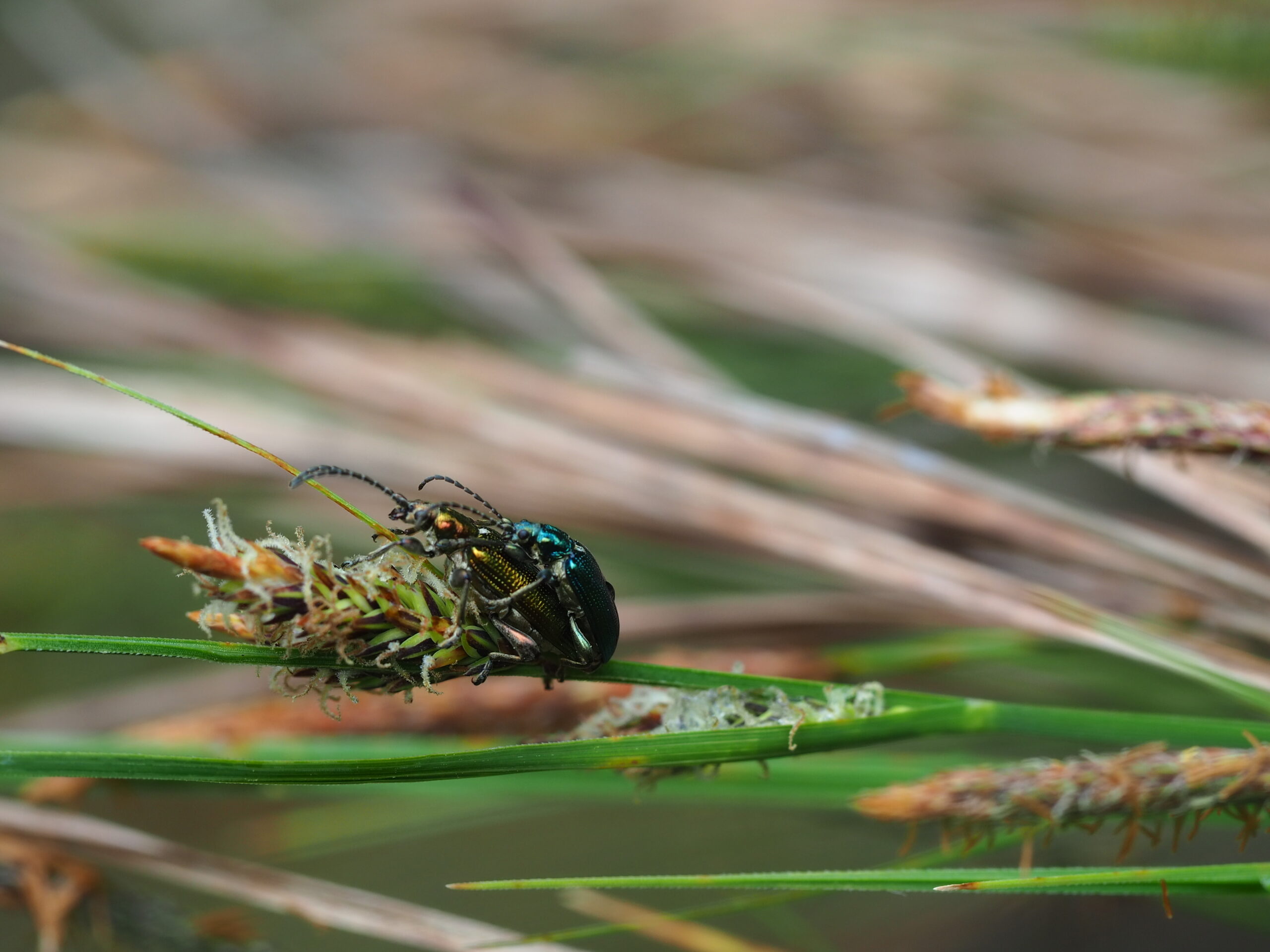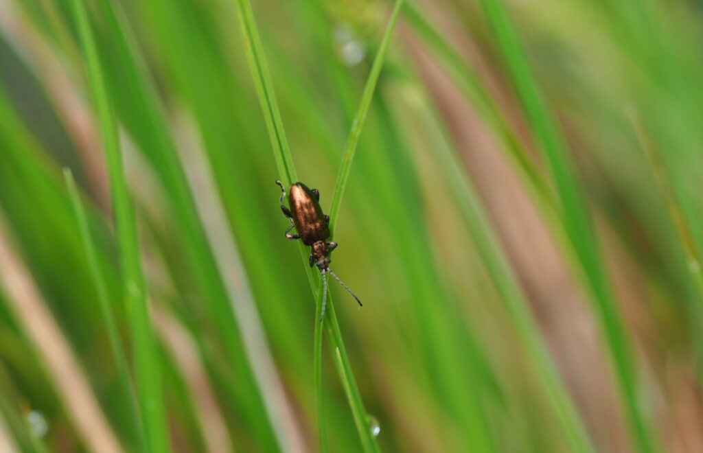 スゲの仲間の花粉を食べるキヌツヤミズクサハムシ、スゲの仲間が多い戦場ヶ原やその周辺では結構な数が見つかります。体色が同種の中でもさまざまな変異があり、一度に何色見つかるか、いつも密かにチャレンジしています。この個体は暗めの銀色。