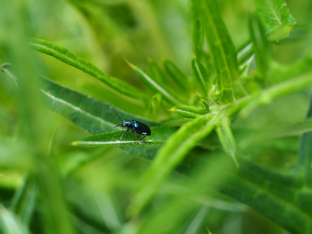 アザミ類の葉を食べるルリクビボソハムシ、この美しい虫に迂闊に手を出そうとすると棘の洗礼を受けることになります。棘だらけのアザミの群落は彼らを守る城のようにも思えてきます。