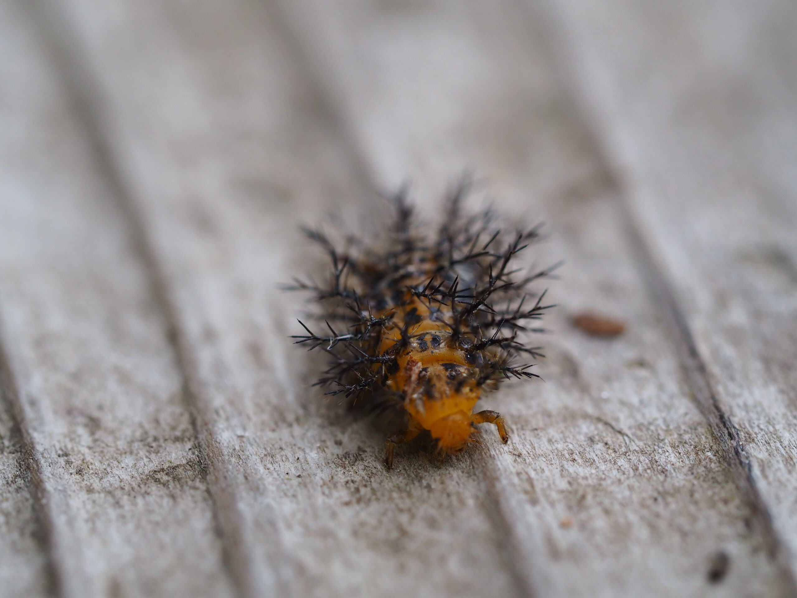 見た目ならタケカレハの幼虫よりもはるかに痛そうなトホシテントウの幼虫、しかしこちらは見かけ倒し。軽くなでると痛いどころか、むしろ気持ちよいとさえ感じるくらいです。