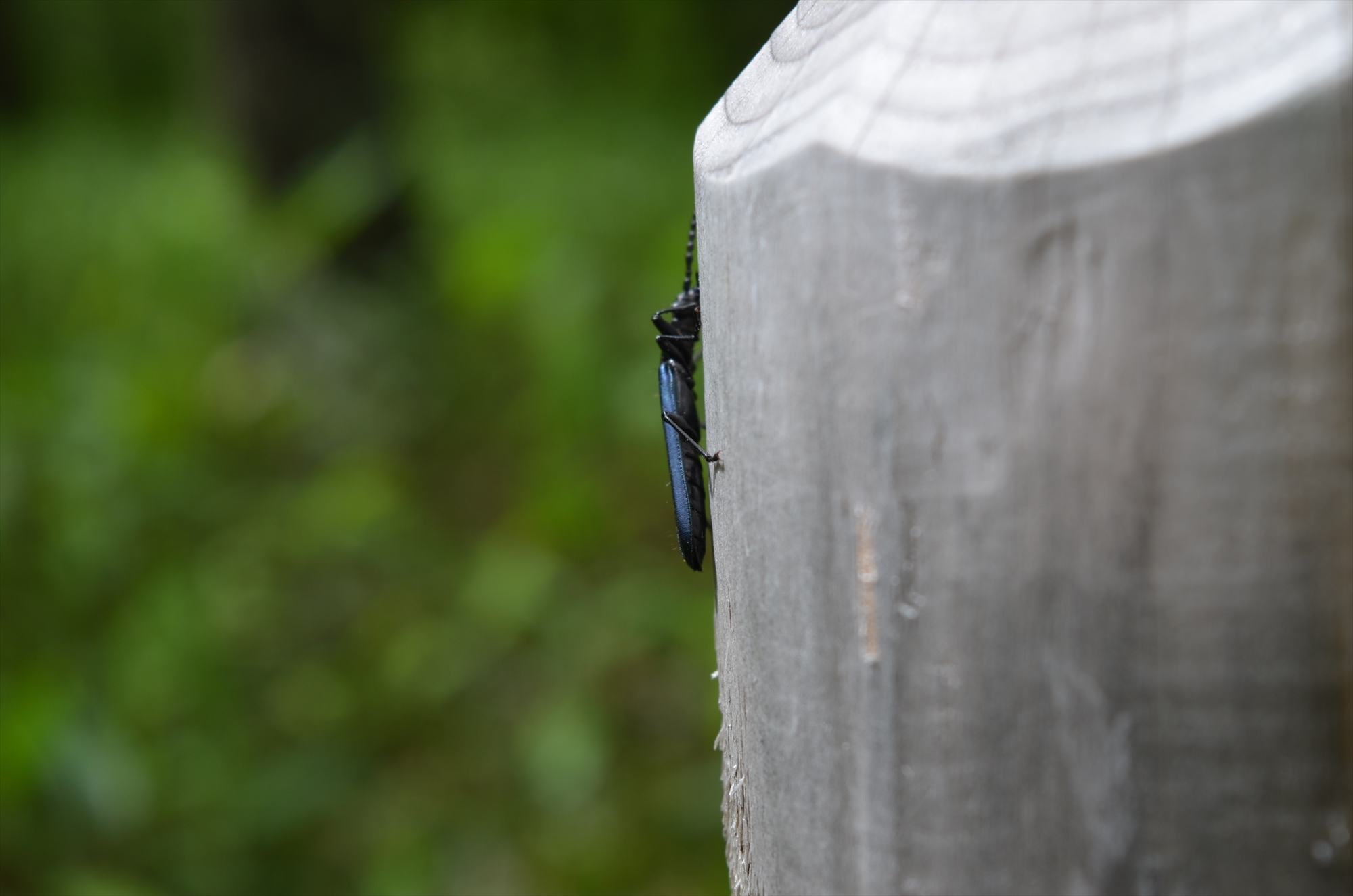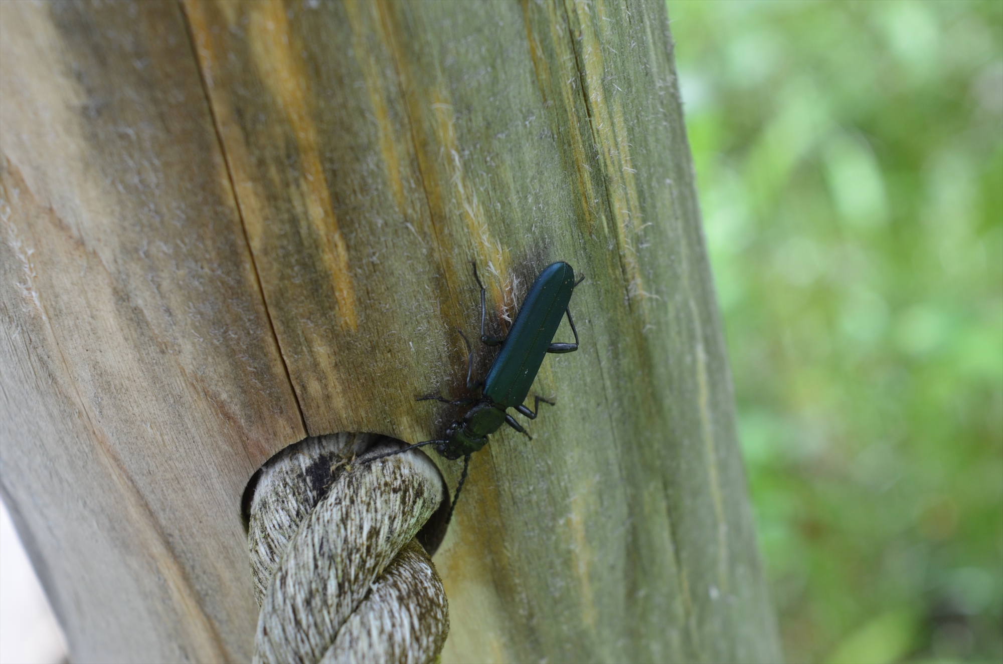 木道を歩いていると、柵の上にルリヒラタムシを見つけました。名前の通り羽が瑠璃色でとても綺麗ですね。でも注目してほしいのは色ではなく、体の厚さなんです!横から見てみると…