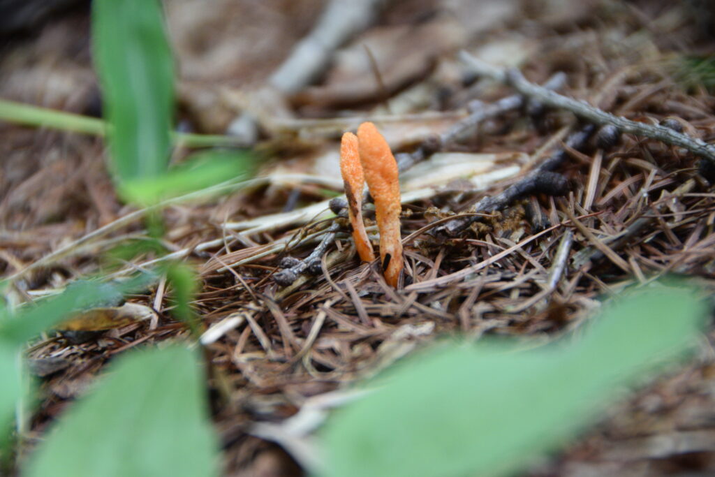 こんな形のキノコは初めて見たので気になって調べてみると、なんと冬虫夏草の仲間かもしれないことが分かりました。