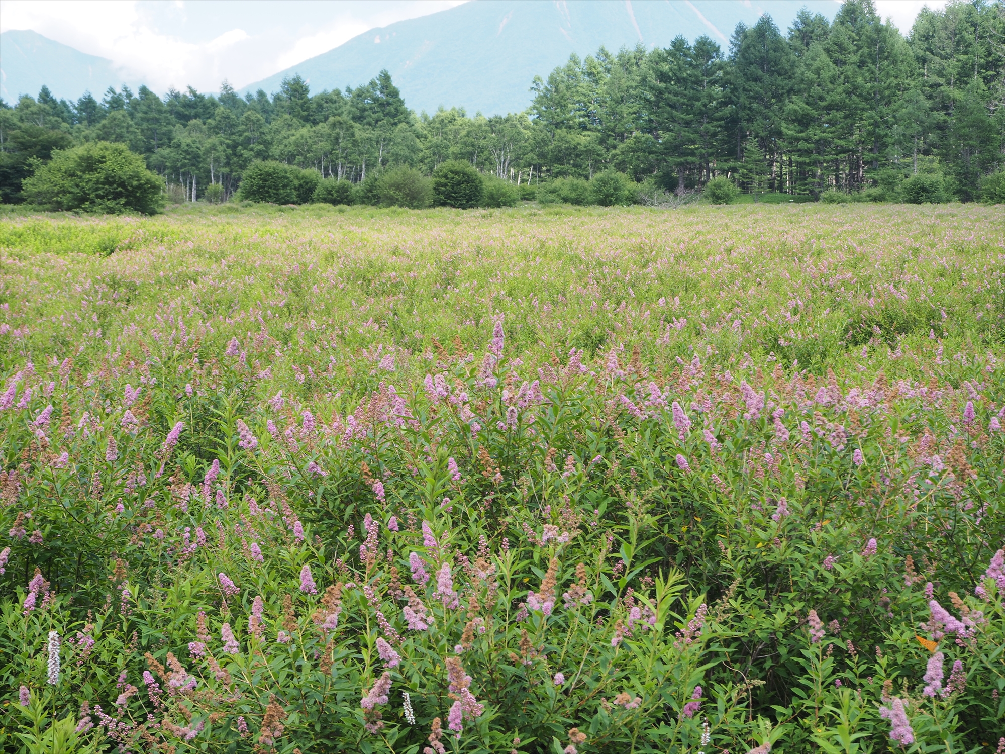 夏の空に雲が映える展望台から10分も歩けば、ホザキシモツケが見頃!