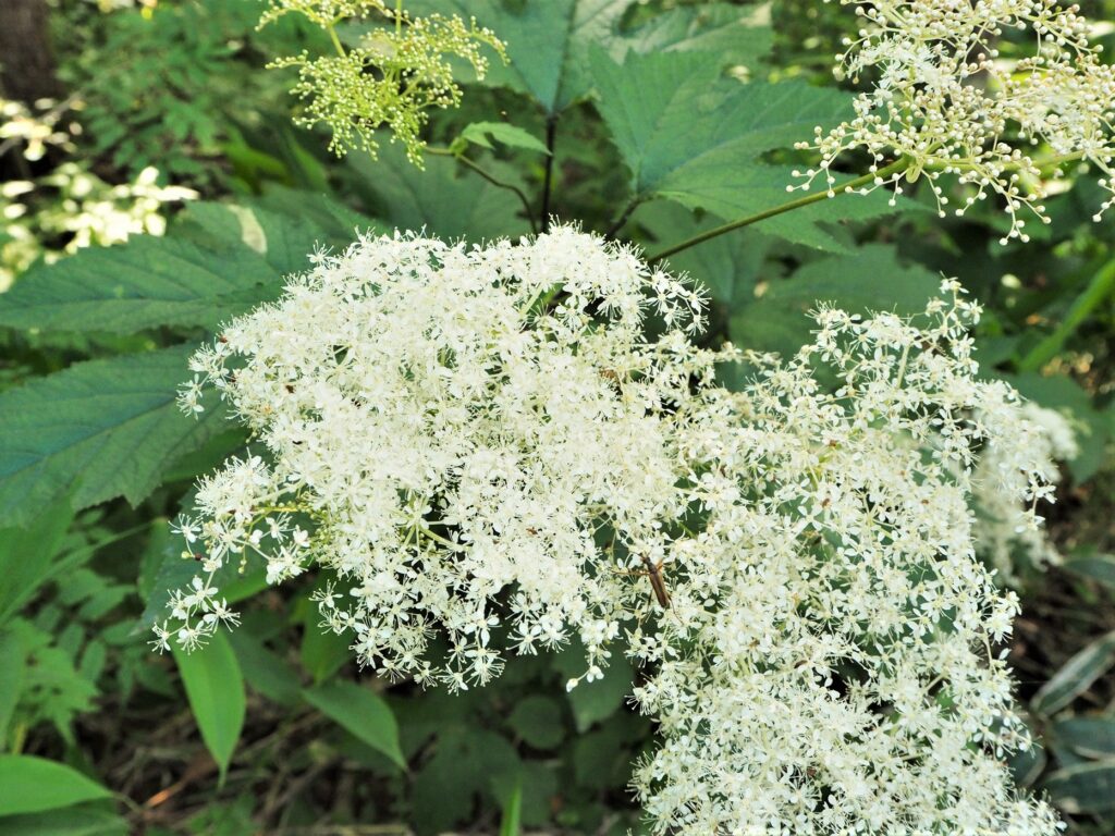 こちらも「シモツケ」ですが、ホザキ~~よりもたくさんの花をつけ、ひとかたまりが直径30cmほどもある「オニシモツケ」。