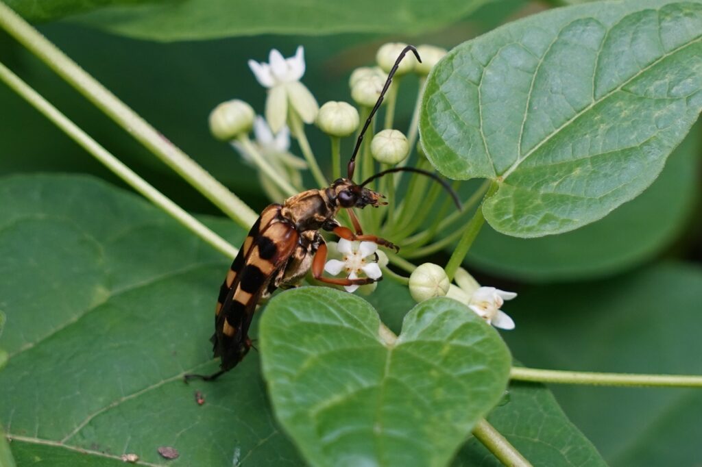 しかし、有毒もなんのその、花真っ盛りのイケマには、オシャレな模様の虫たちが集まっていました。