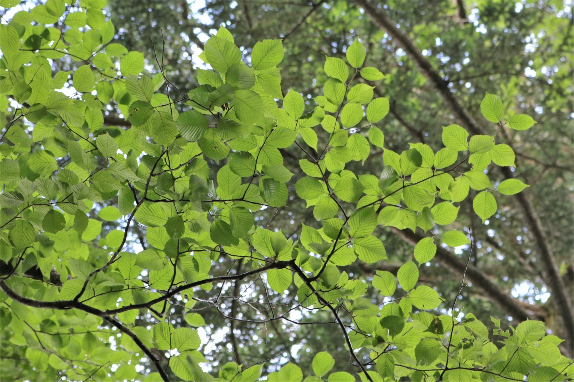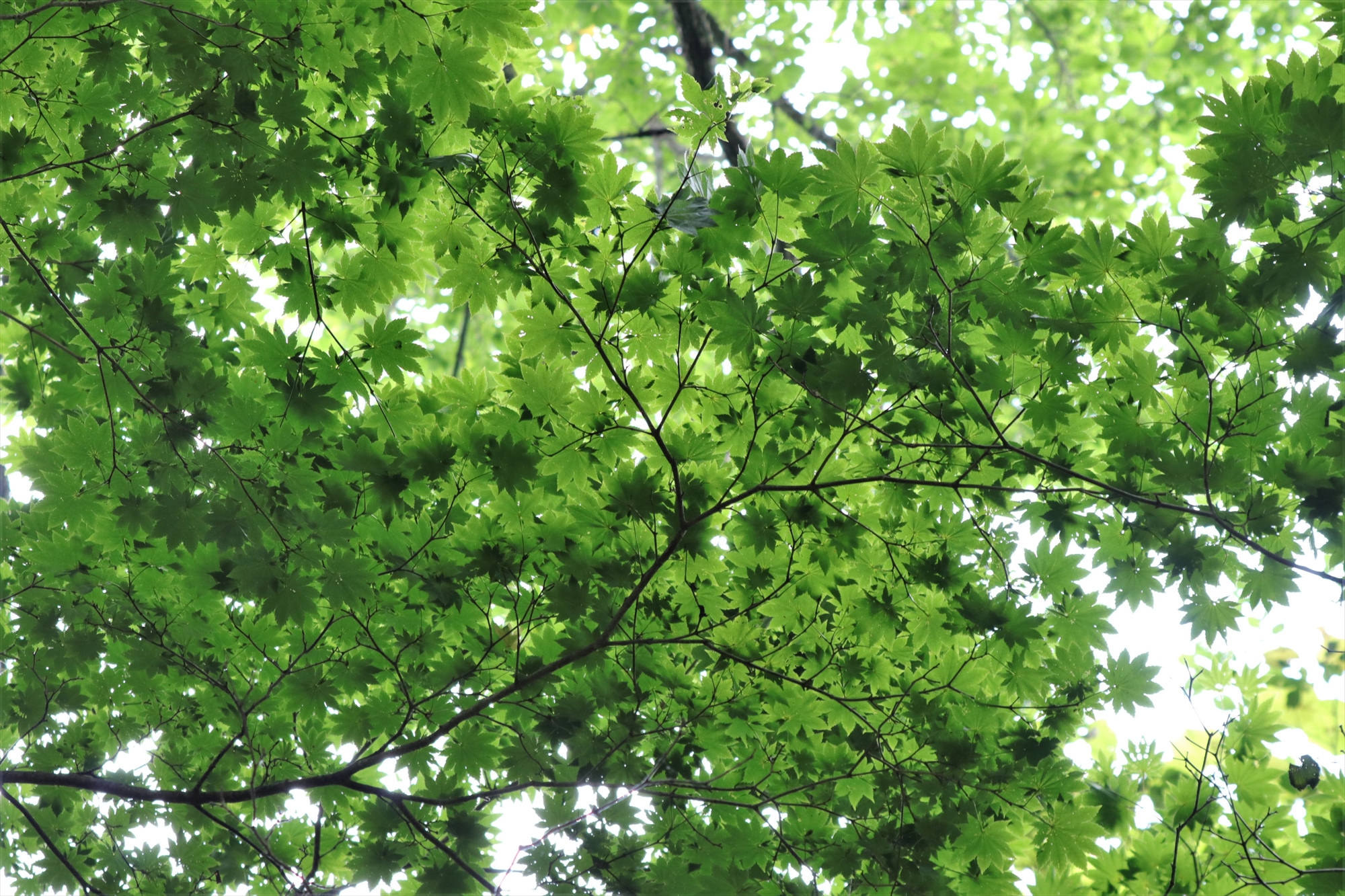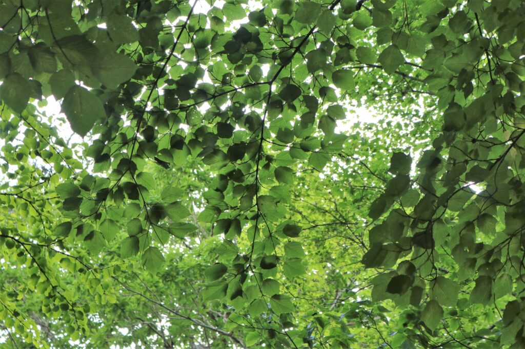 森の中に入り、再び頭上を見上げれば太陽の光で透かされた葉っぱたちが何層にも重なって、自然のステンドグラスのようにきらきらと輝いていました。