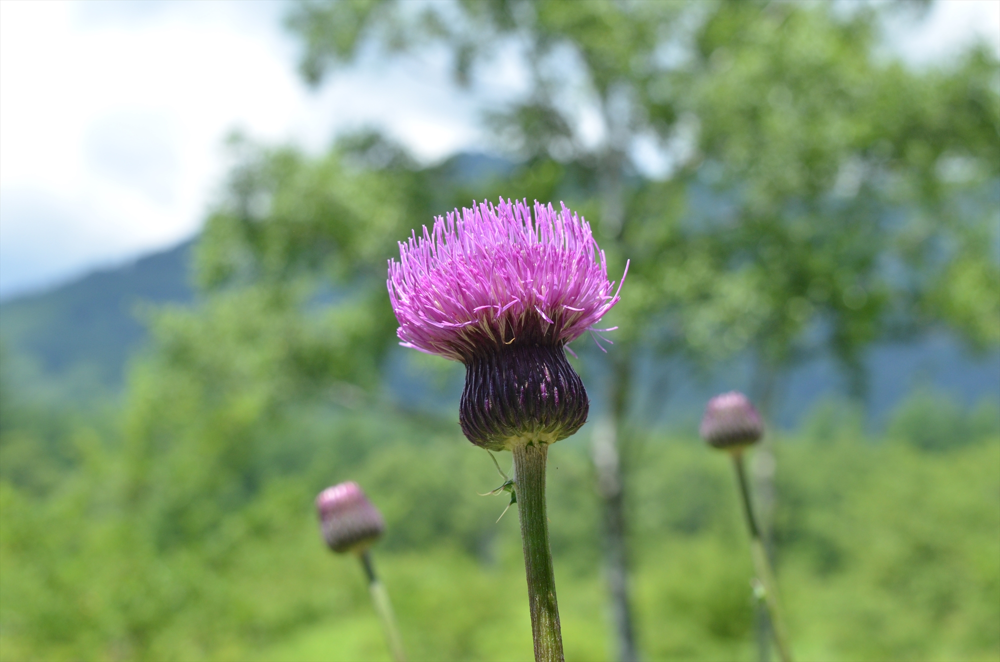 小田代歩道を抜けて小田代原の東側を10分程歩いて景色が開けたところに出ると、最初にノアザミの花が見えました。