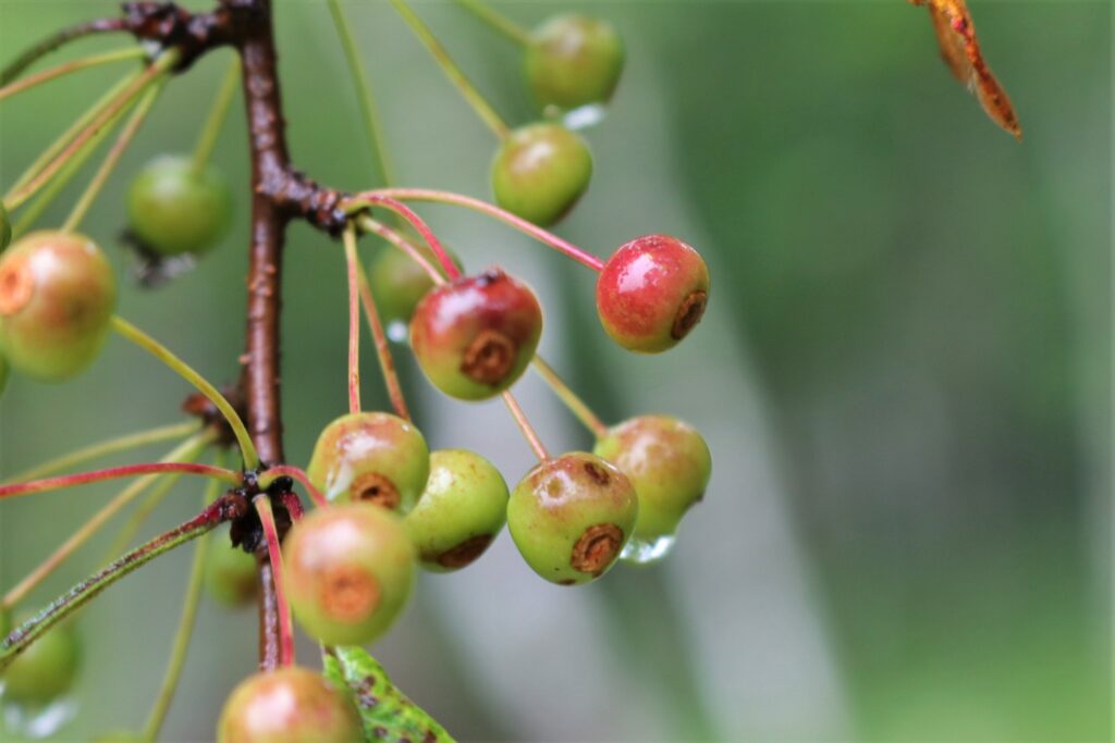 正体はズミの実。ズミは6月頃に白い花をつけ、10月には赤い実をつける樹木です。まだ全部が赤く染まりきってはいませんでしたが、早くも緑色から少しずつ赤色に変わっているのもありました。実を覆う雨粒は少し水飴っぽくて、りんご飴みたいにも見えました。(ちょっと美味しそう…)