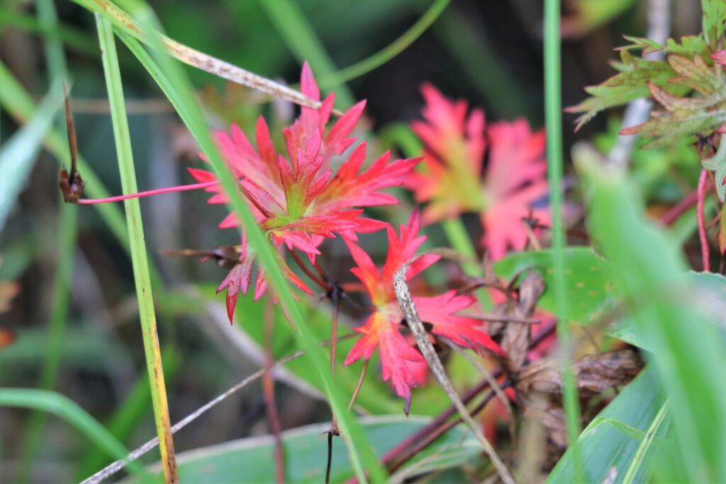 こちらはハクサンフウロの葉っぱです。夏にピンク色の花を咲かせるハクサンフウロの葉っぱは紅葉すると緑色から鮮やかな赤色になります。