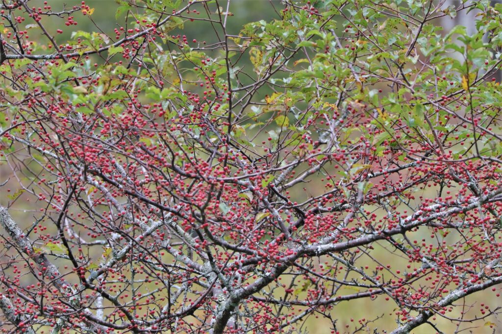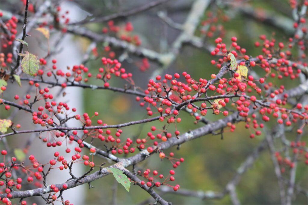 というのはまだ早く、こちらはズミの実。真っ赤になった実が、遠目からみるとまるで紅葉しているよう。