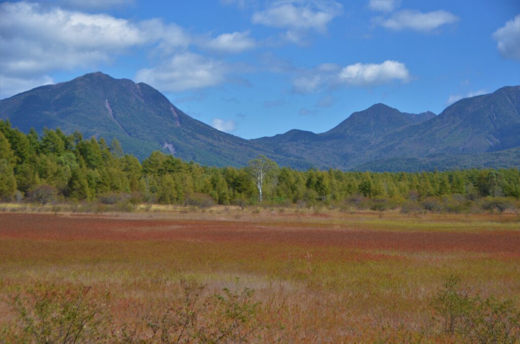 スタート地点の赤沼車庫から約12分。戦場ヶ原の隣にある小田代原では、足元の草紅葉が見頃を迎えています!青空の色と草紅葉の赤が良いアクセントになっています!霜が降りてあっという間に葉が茶色くなってしまうこともあるので、来られる際はお早めに。