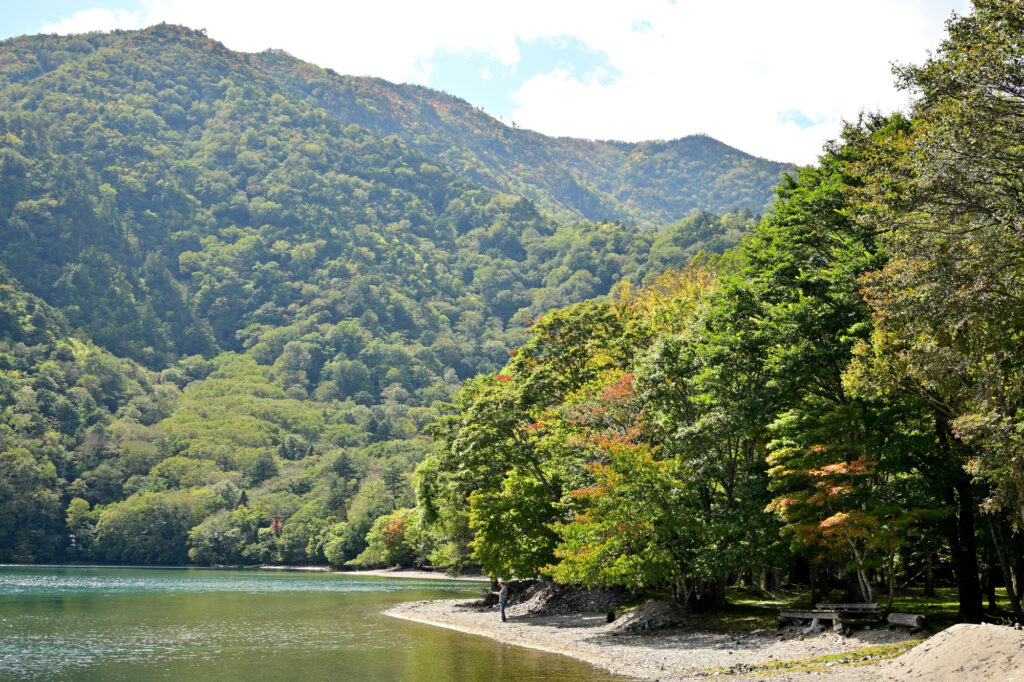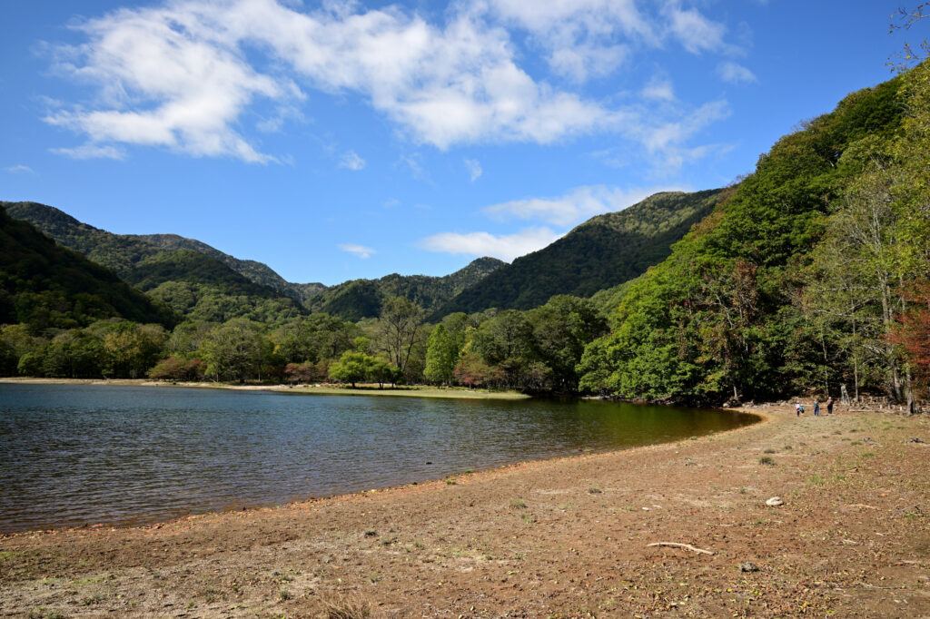 西ノ湖を取り囲む山肌の木々は、ほんのり色が抜けてきているところ。見頃となるにはまだ1週間以上かかりそうです。
