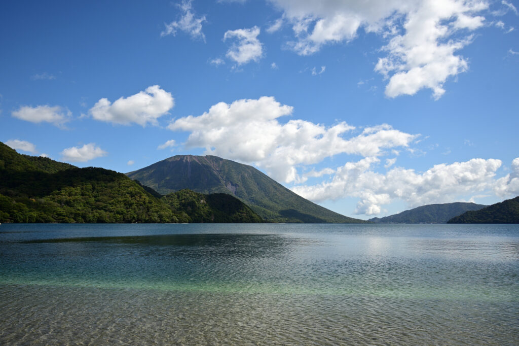 バスで赤沼から30分、西ノ湖から千手の森歩道経由で歩くと小1時間の千手ヶ浜。台風一過のスカイブルーが眩しい!絶景!