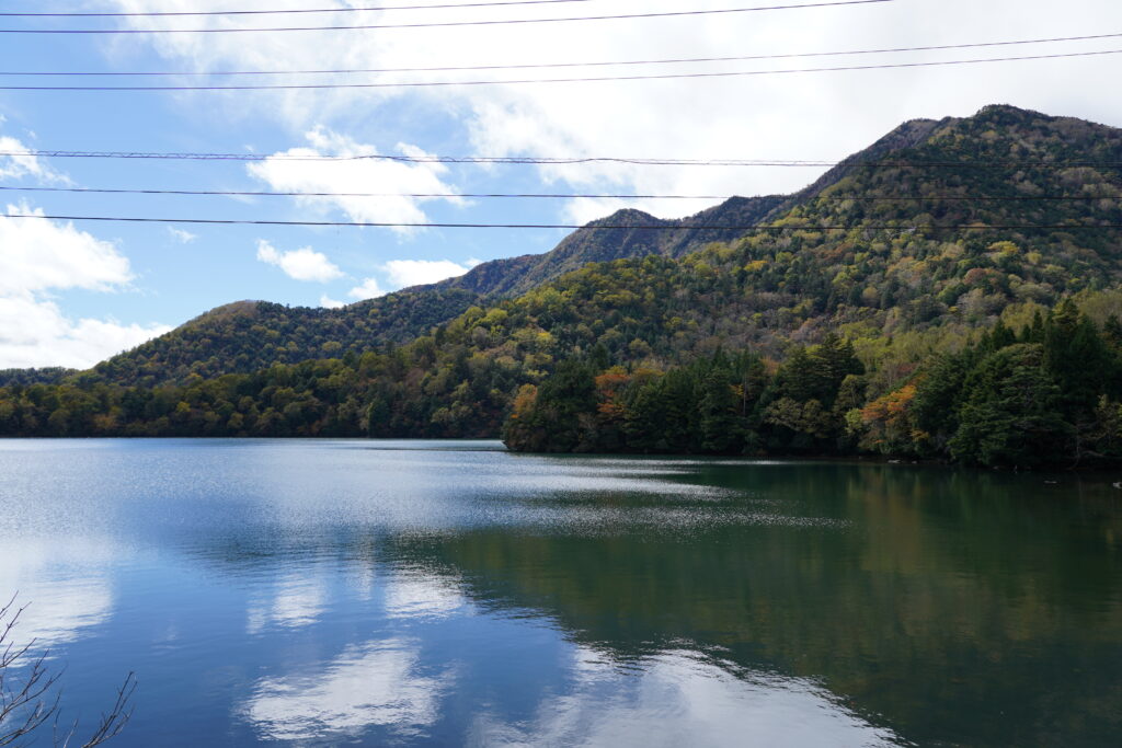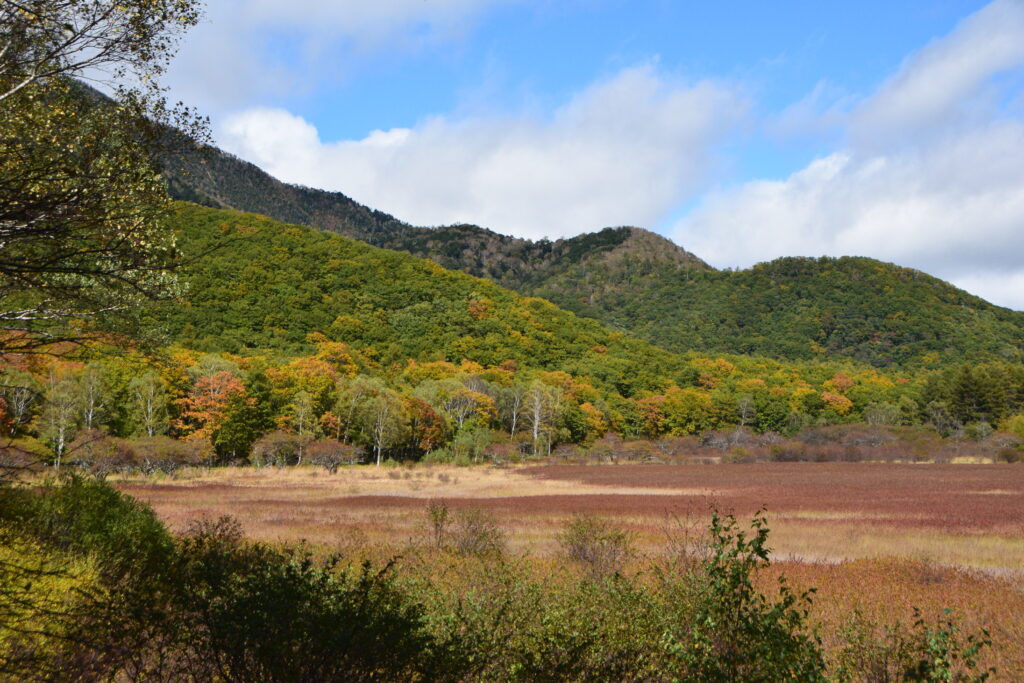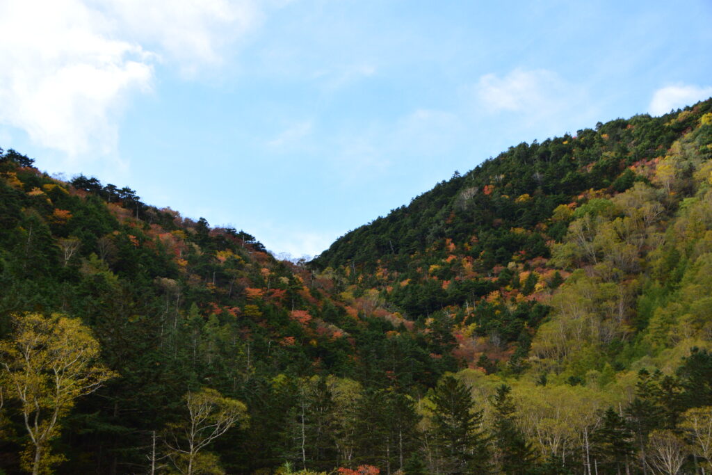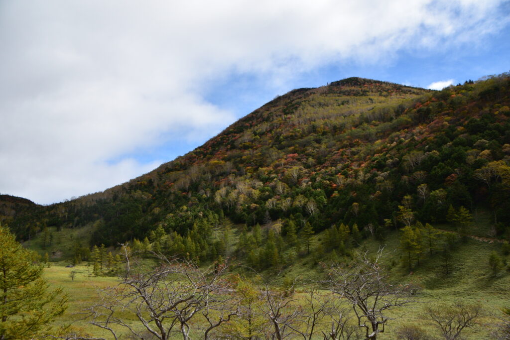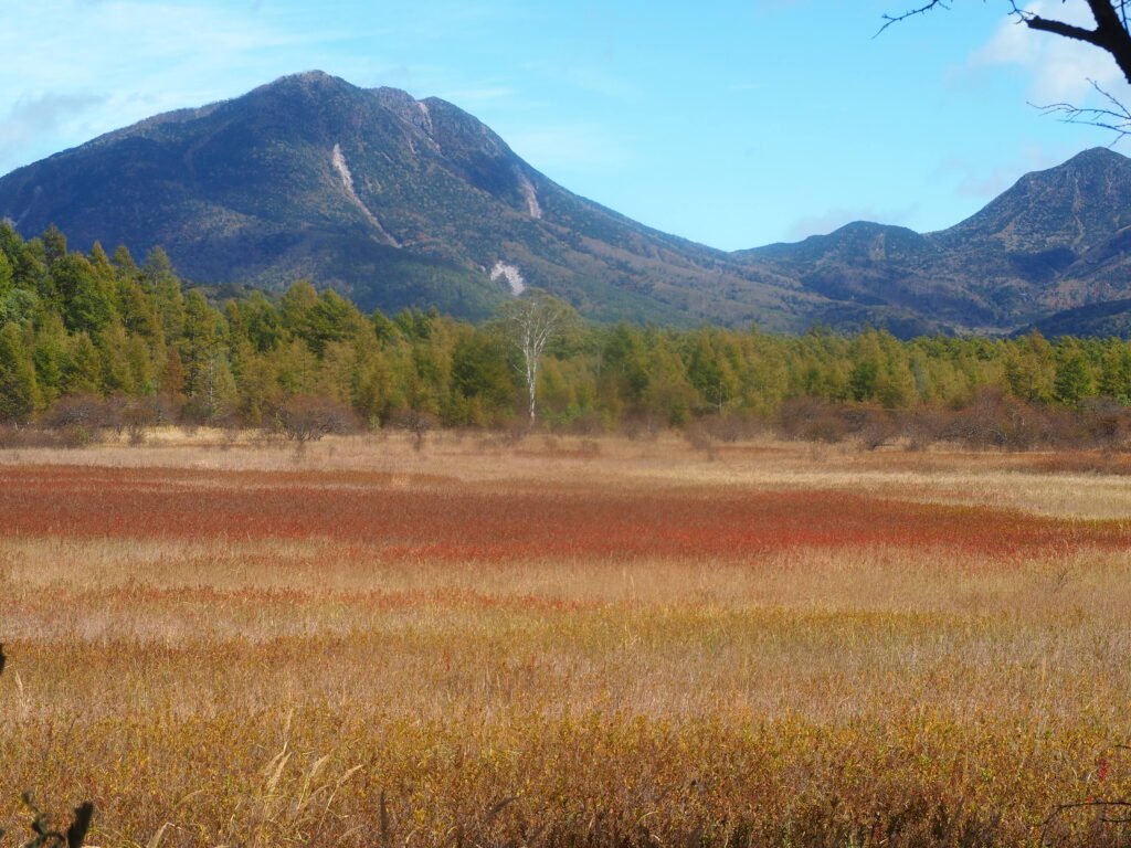 刈込湖・切込湖の先にある涸沼。その周辺は少しマイナー気味ですが立派な紅葉スポットで、こちらも既に見頃入り。山王帽子山などの周辺の山肌がカラフルです。