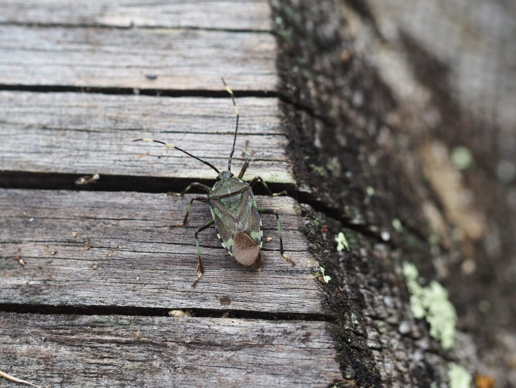 秋らしい風景にどんどん変わっていく中で、空気もひんやり冷たくなっています。そんな中、寒さで動きが鈍くなりながらも丸太の上を歩いていたのはナシカメムシ。体の所々に入る暗めの緑色が地味ながら美しく、ひそかなお気に入りのカメムシです。暗い薄めの緑色が冷たい風に吹かれ触角がなびいていますね。
