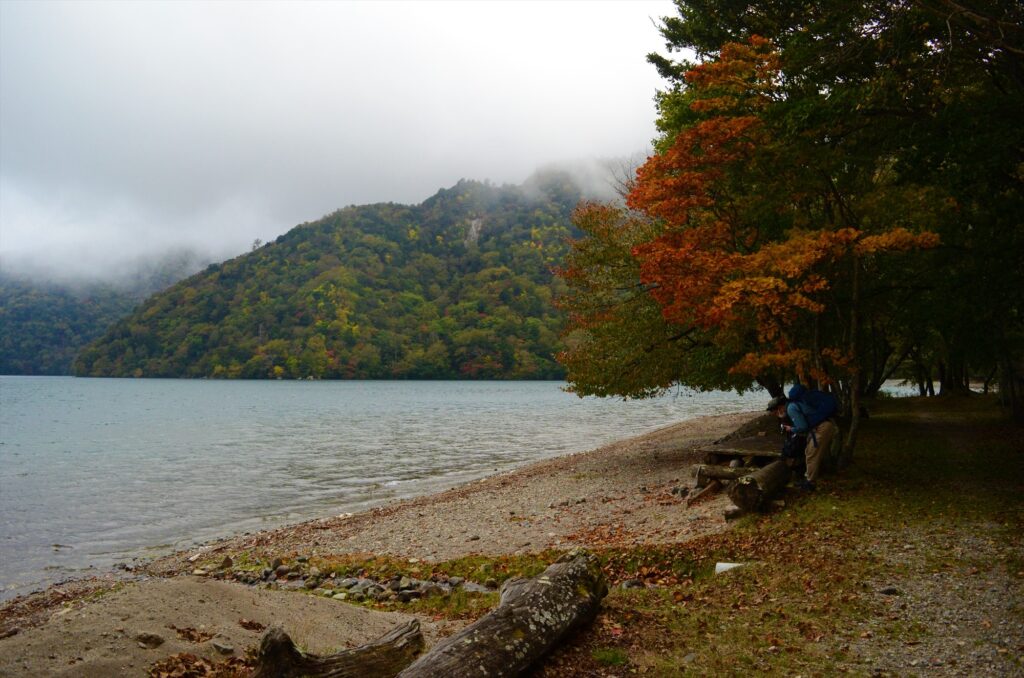 各地で紅葉が進む奥日光。中禅寺湖畔の千手ヶ浜では、千手堂へ向かう歩道沿いはまだ緑の葉が多いです。が、千手堂方面の山肌を見ると、下の方まで赤や黄色がしっかり出ており見頃始まりといった様子です。
