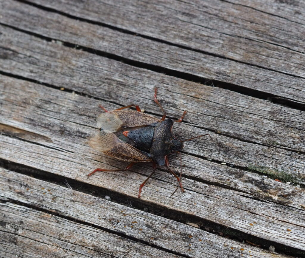 すぐ近くにはアカアシカメムシの姿も。名前通りの赤い脚以上に、メタリックな輝きを放つ黒い体が目を惹きます。「臭い!」と嫌われがちなカメムシですが、形や色はさまざまでその中には美しいものも多いのです。