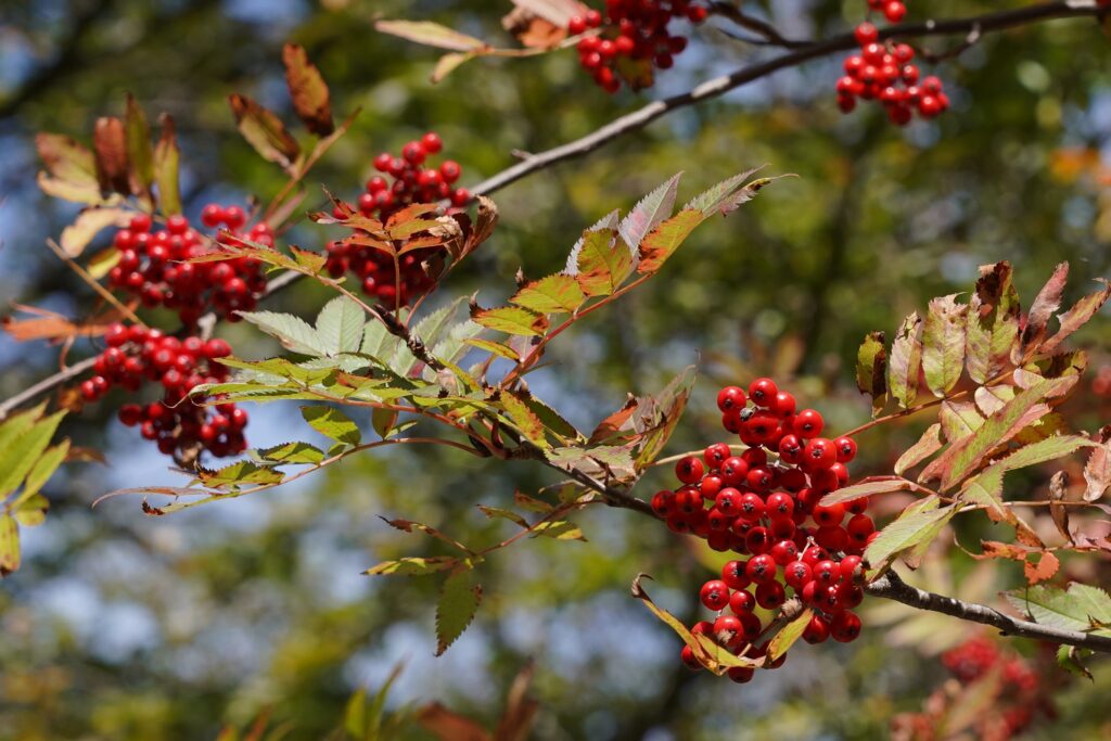 葉の紅葉が楽しめるナナカマドの枝先にはぷりっぷりの赤い実がたくさん!
