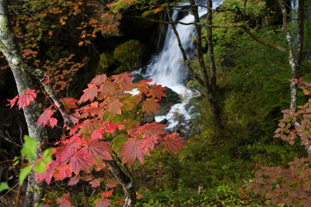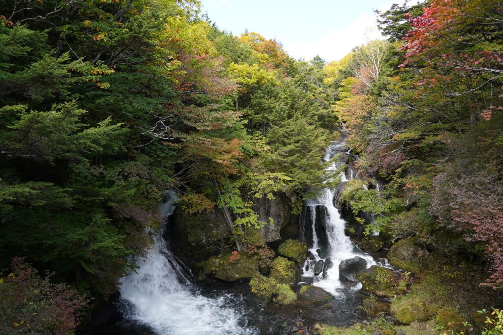 奥日光は、標高による気温差により、上から下へ降るように紅葉が色づいていきますが、竜頭滝では冷気が川の上を通り抜け、滝の窪地にたまるため、同じ標高の他地域よりも早く色づきが進みます。