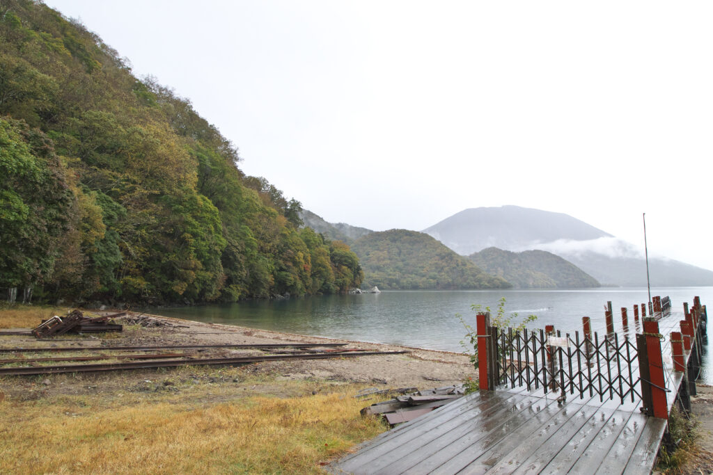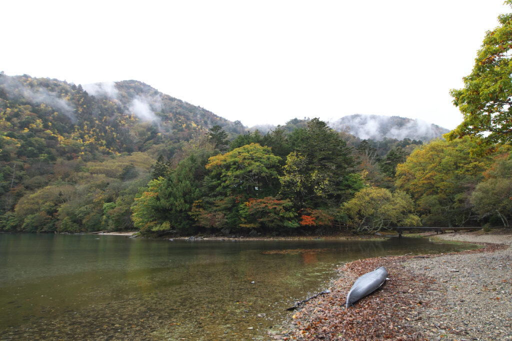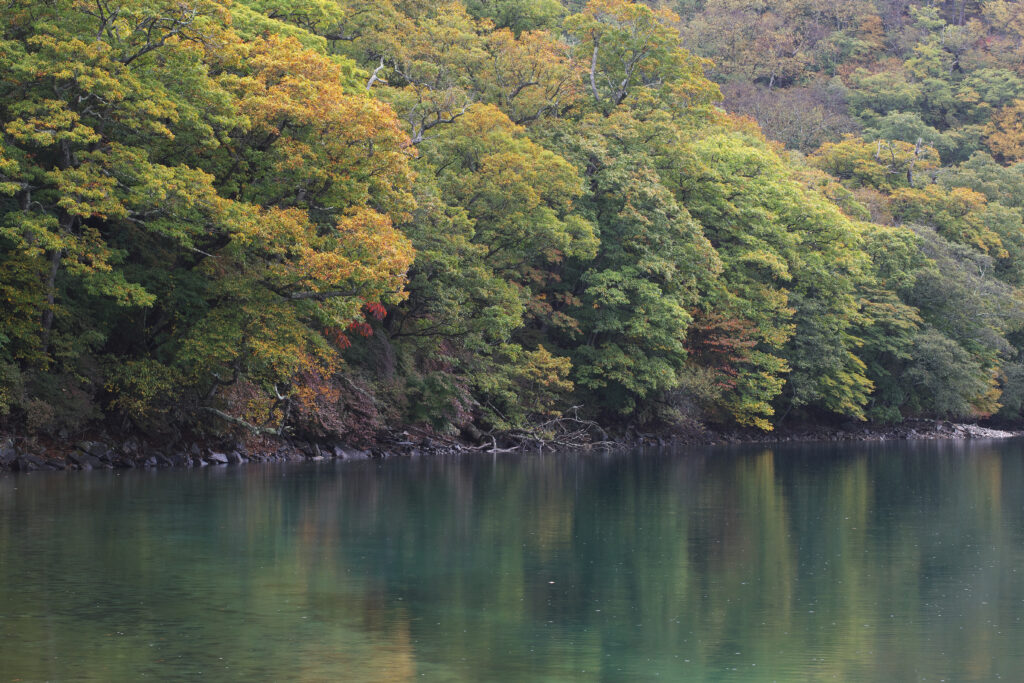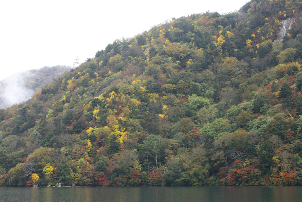 桟橋付近から見た北岸方面の色づきはまだこれから、という印象。