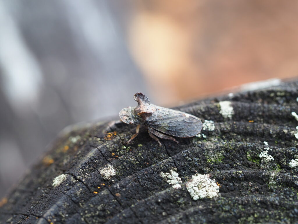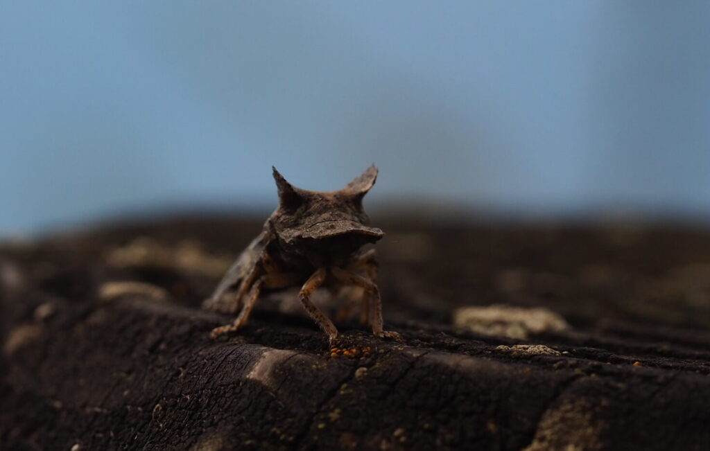鳥ではない、昆虫のミミズクです。樹皮のような色は目立ちにくいですが、体の上方に突き出た突起や平らな奇妙な形の頭は一度見たら忘れられません。