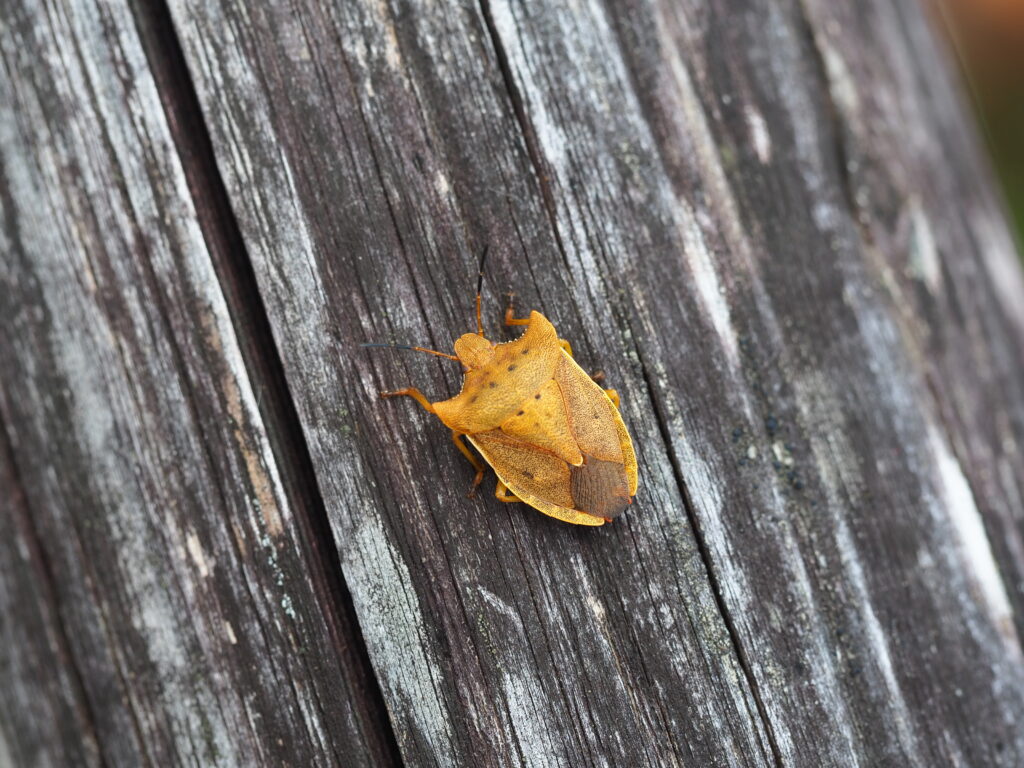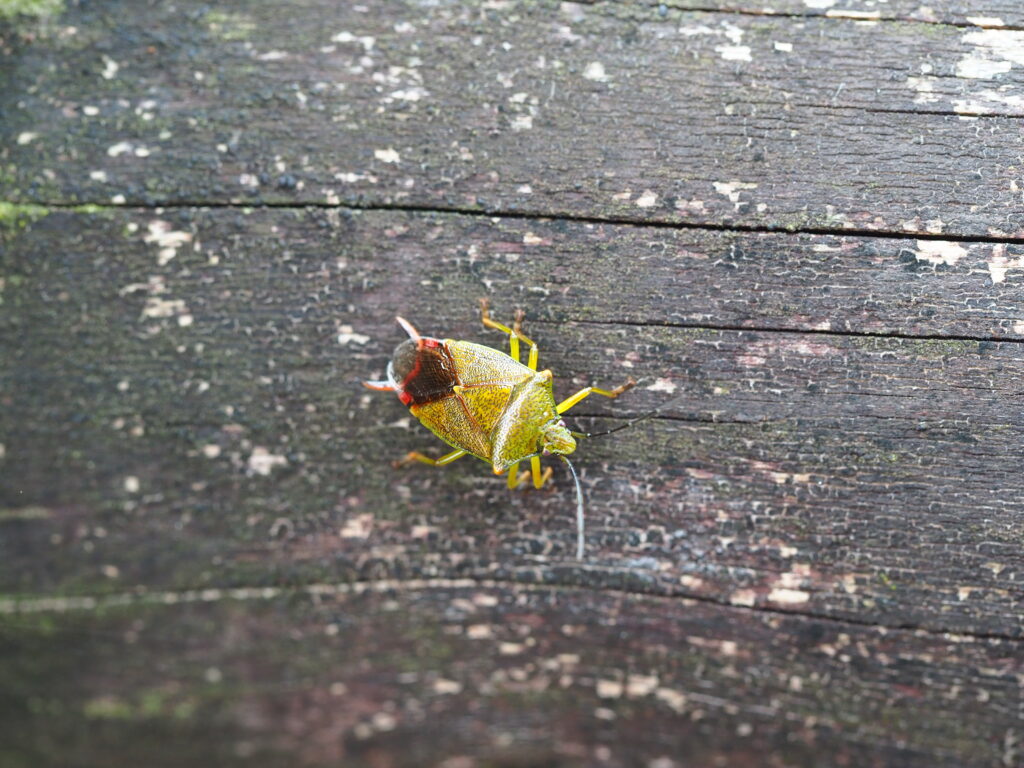 この他にもカメムシの仲間に次々遭遇し、計10種類程度に。これだけ出会うまでにわずか1分程度、歩いた距離も10数メートルといった所。それだけの短時間・短距離でも色も形もさまざまなカメムシたちに出会える、中禅寺湖畔の自然の有難さを改めて実感した約1分間でした。(松)