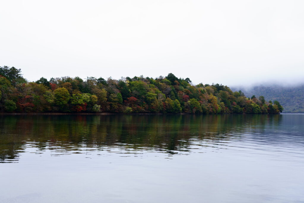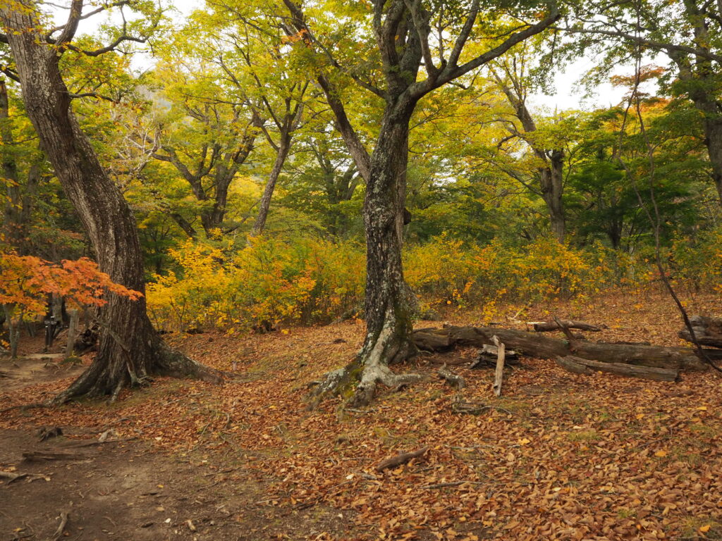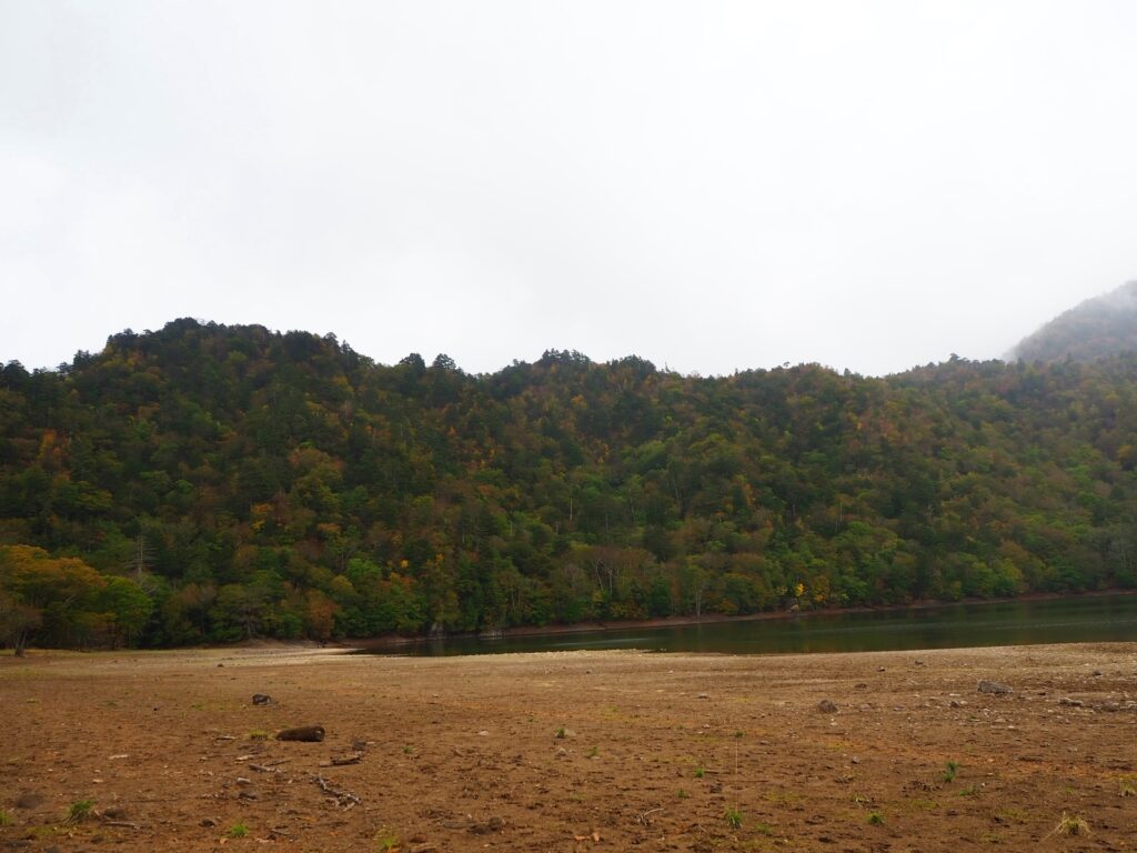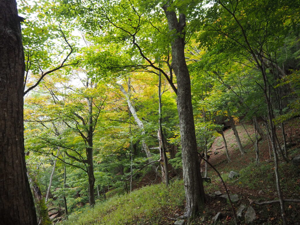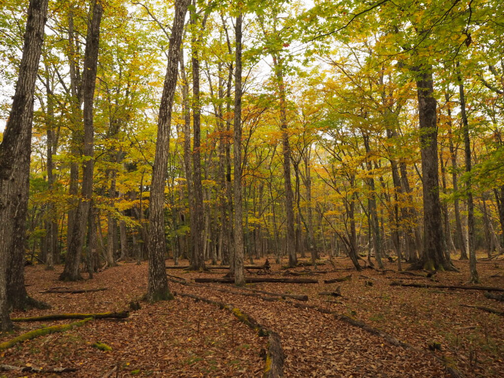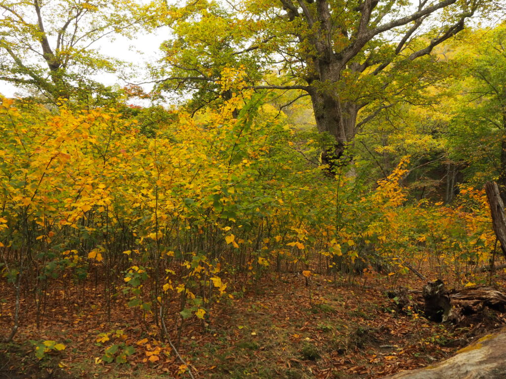 場所によって差がありますが、どちらかというと千手ヶ浜寄りの地点ではミズナラやアズキナシなどの黄葉が楽しめます。西ノ湖寄りの地点ではまだ緑が優勢です。
