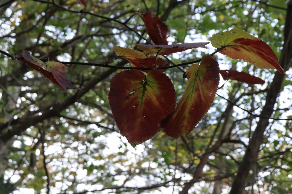 他にもラッキーなことが起こったんです!歌ヶ浜駐車場から湖畔沿いにしばらく進むと、赤く染まったヒトツバカエデを見つけました。実はこの植物は秋になると赤ではなく黄色に染まるのです。赤くなるのはレアケース‼
