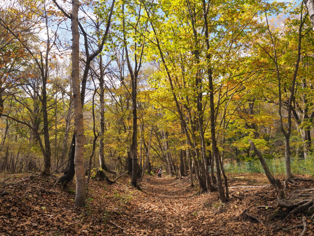 市道1002号線の入り口付近のミズナラは色づきが早いことと、最近の強風により、ほとんど落葉していますが、西ノ湖付近のミズナラはまだしっかり葉っぱがついているのでこちらもこれからに期待!