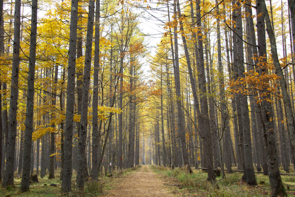 西ノ湖入口から西ノ湖へ向かう途中のカラマツ林がきれいです、光の具合によっては輝いちゃいます。