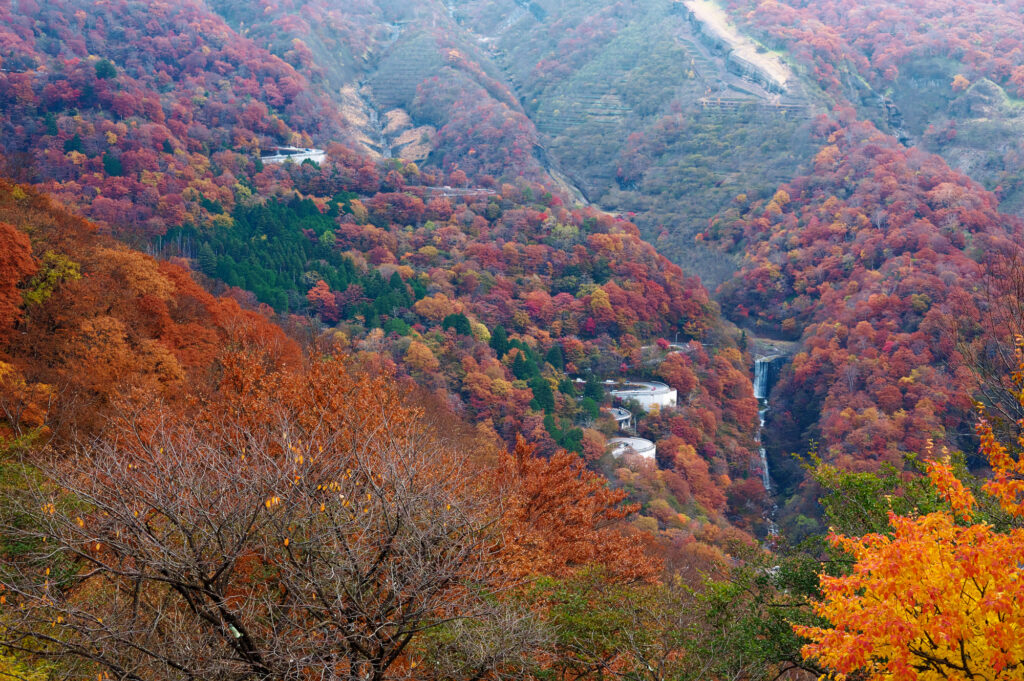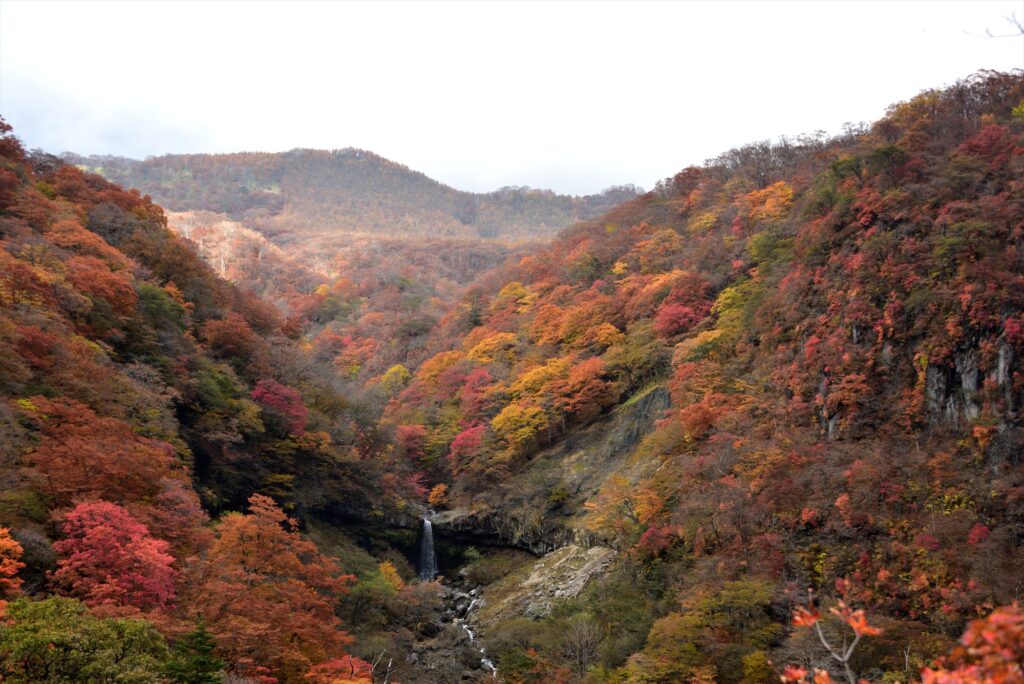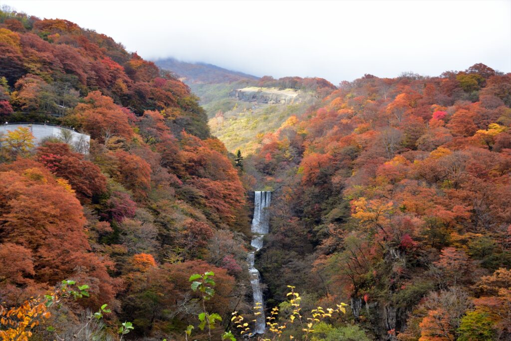 鮮やかな紅葉の中を流れ落ちる2つの滝は神秘的です。