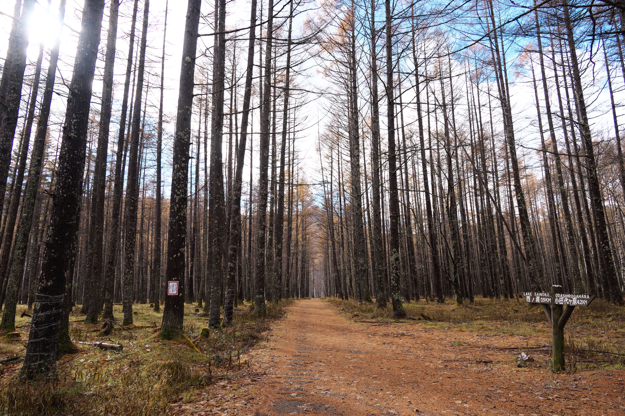 カラマツ林もすっかり落葉して、明るい道の進んで行きました。