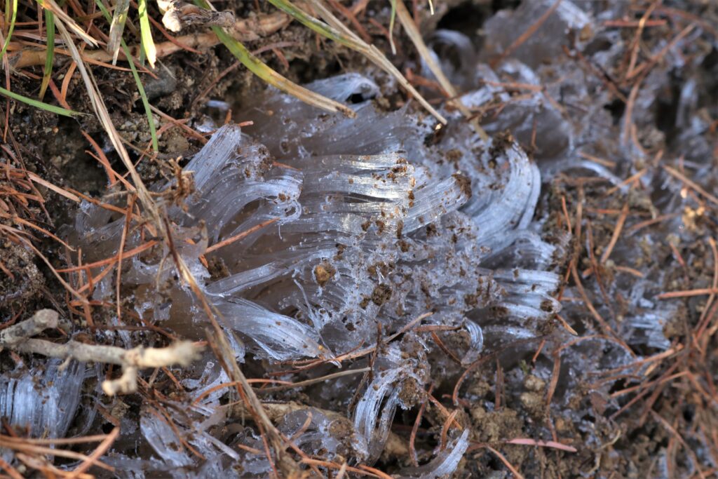例えば霜柱。長さ5、6㎝ほどの霜柱がまっすぐ伸びていたり、先っぽだけくるんと丸まっておしゃれなものがあったりと、さまざまな形の霜柱は観察していて飽きませんでした。