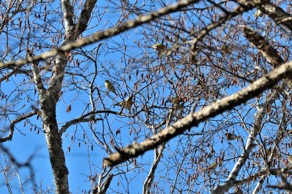 小鳥の正体はマヒワ。大きさは12㎝ほどでスズメよりも小さな鳥です。葉が落ちた森の中だと枝先でちょこちょこと動く姿が目立ち、今までは見にくかった仕草などもじっくり観察することができました。