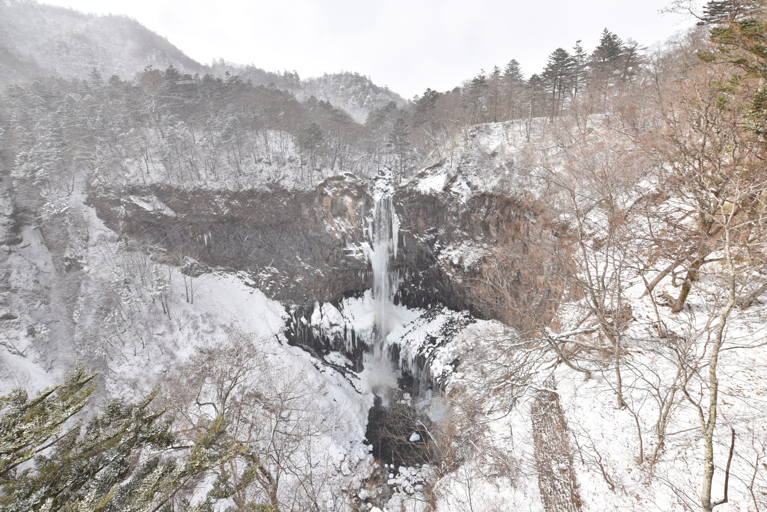 ここから徒歩5分の華厳滝には大きな氷柱が幾つも付いて、見応え十分!