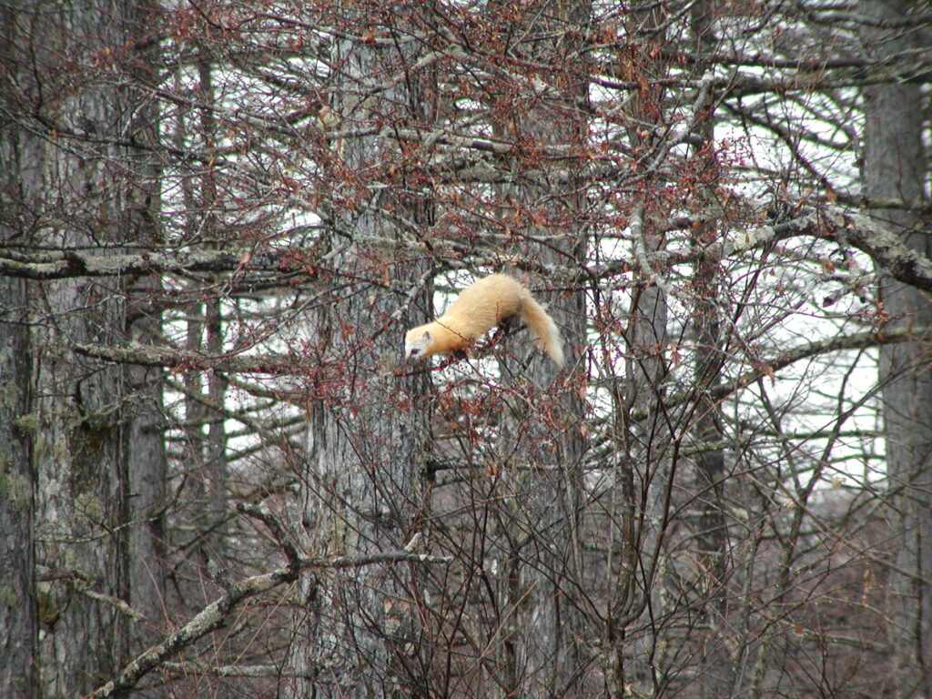 イタチの仲間、テンが走っているところを見られたんです!キツネのようなきれいな黄金色をしていて、周りが真っ白な中ひときわ目立っていました。