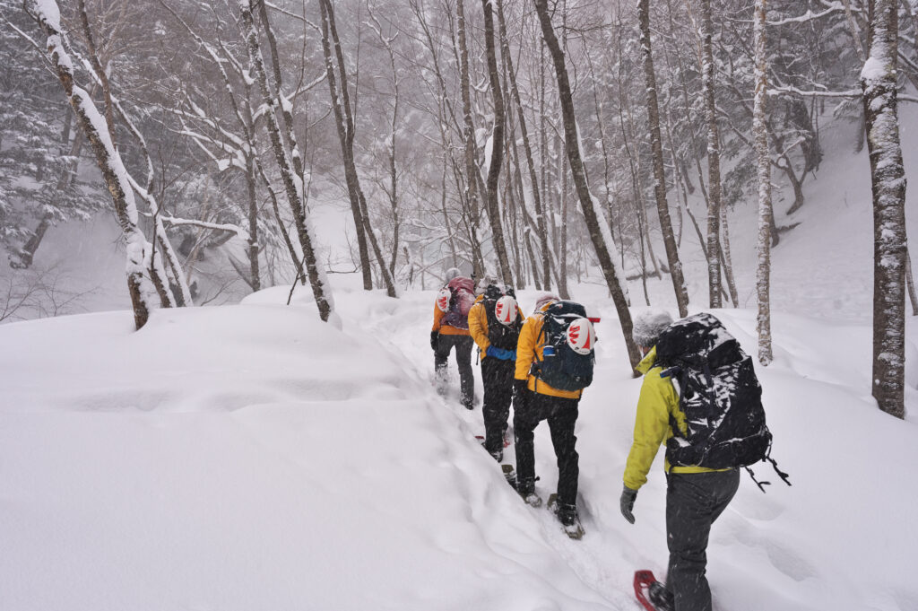 往復約5時間かかる長距離のコースで、沢地形の中を歩くため、上がり下りが多いです。また、庵滝までは管理されているコースではないため、雪も相まって道が分かりづらくなっています。なので中級者~上級者向けとなります。