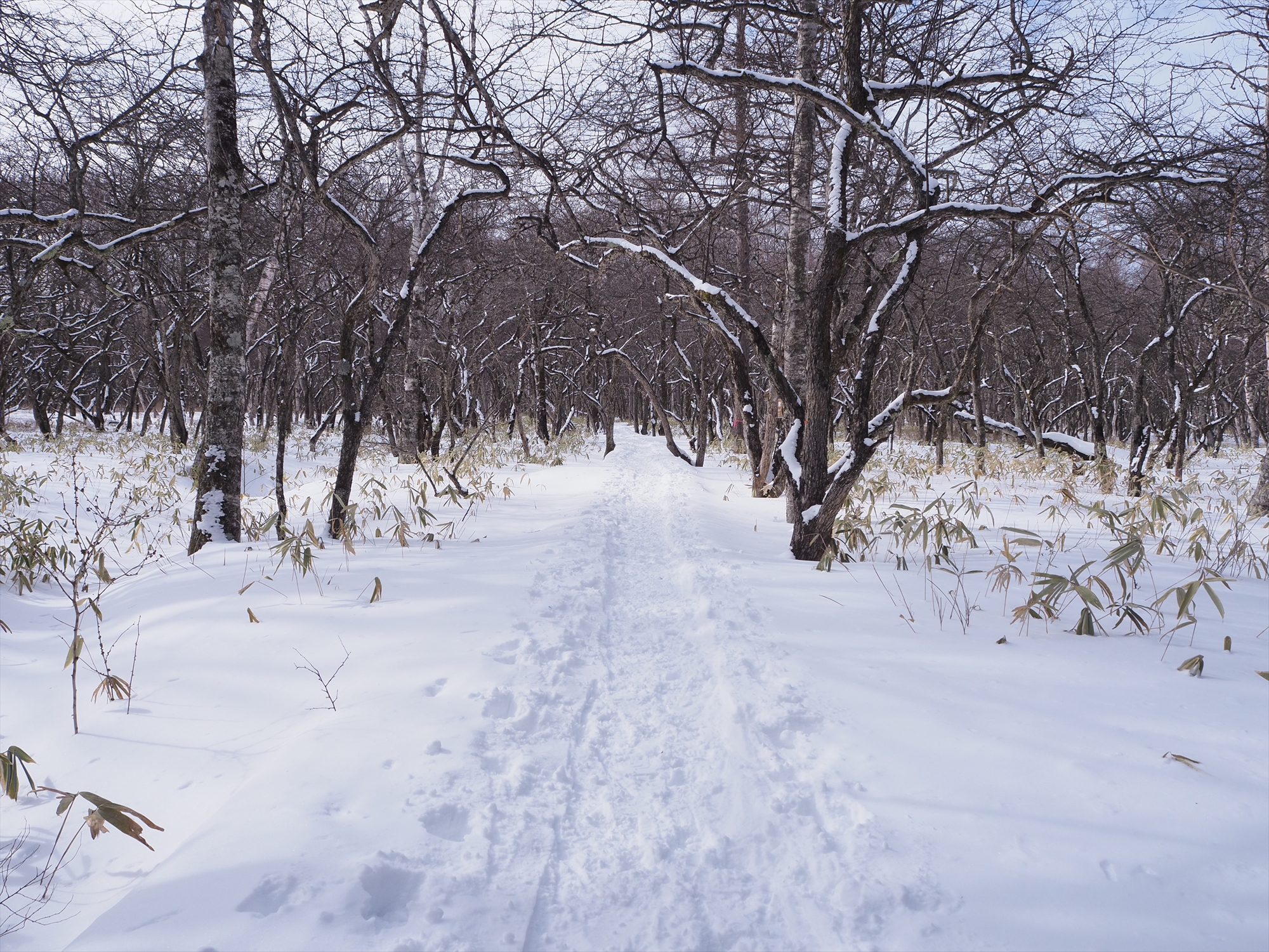 雪に埋もれて、木道のふちがパッと見、わかりにくいため、踏み外さないよう気を付けながら進んでいきましょう。
