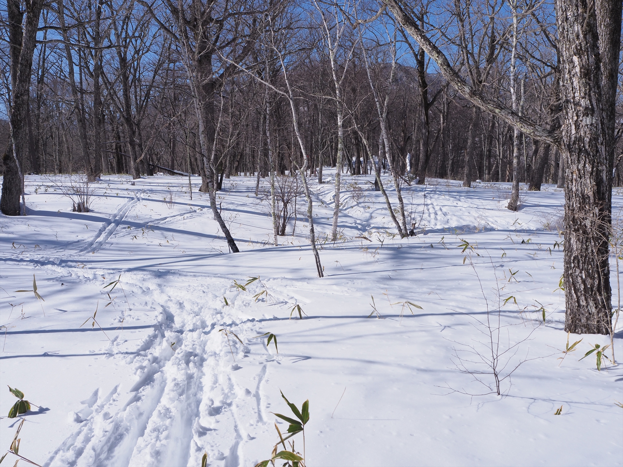 写真右にある踏み跡が夏道です。ただし道が細く、1m前後の小さく急なアップダウン(細い沢地形)と細かなカーブが組み合わさった、意外と複雑な道でした。