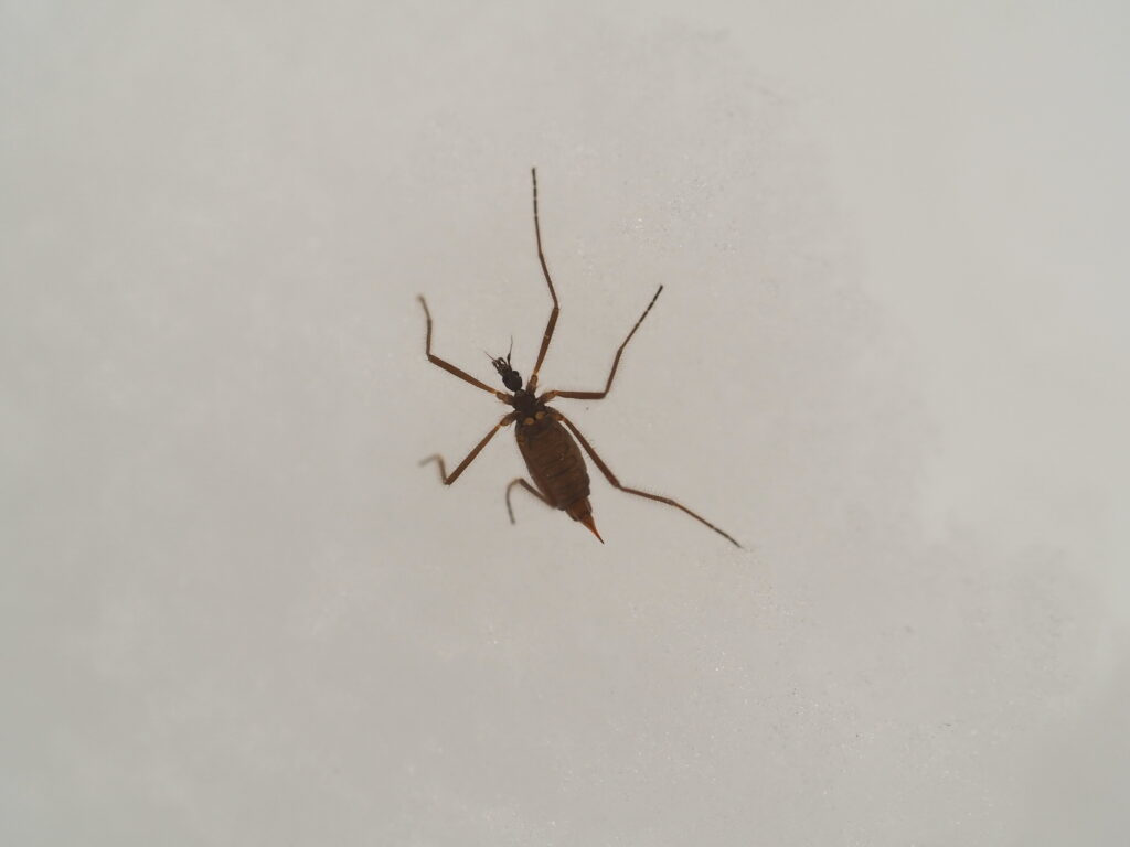 クモやアメンボに似た印象を受けるクモガタガガンボの仲間などです。他の多くの昆虫が静かに冬を越している中、翅の退化した身で歩き回る変わり者たちです。どちらも体長は1センチ以内と小さいですが、黒や褐色の体のため白い雪の上では案外目立ちます。