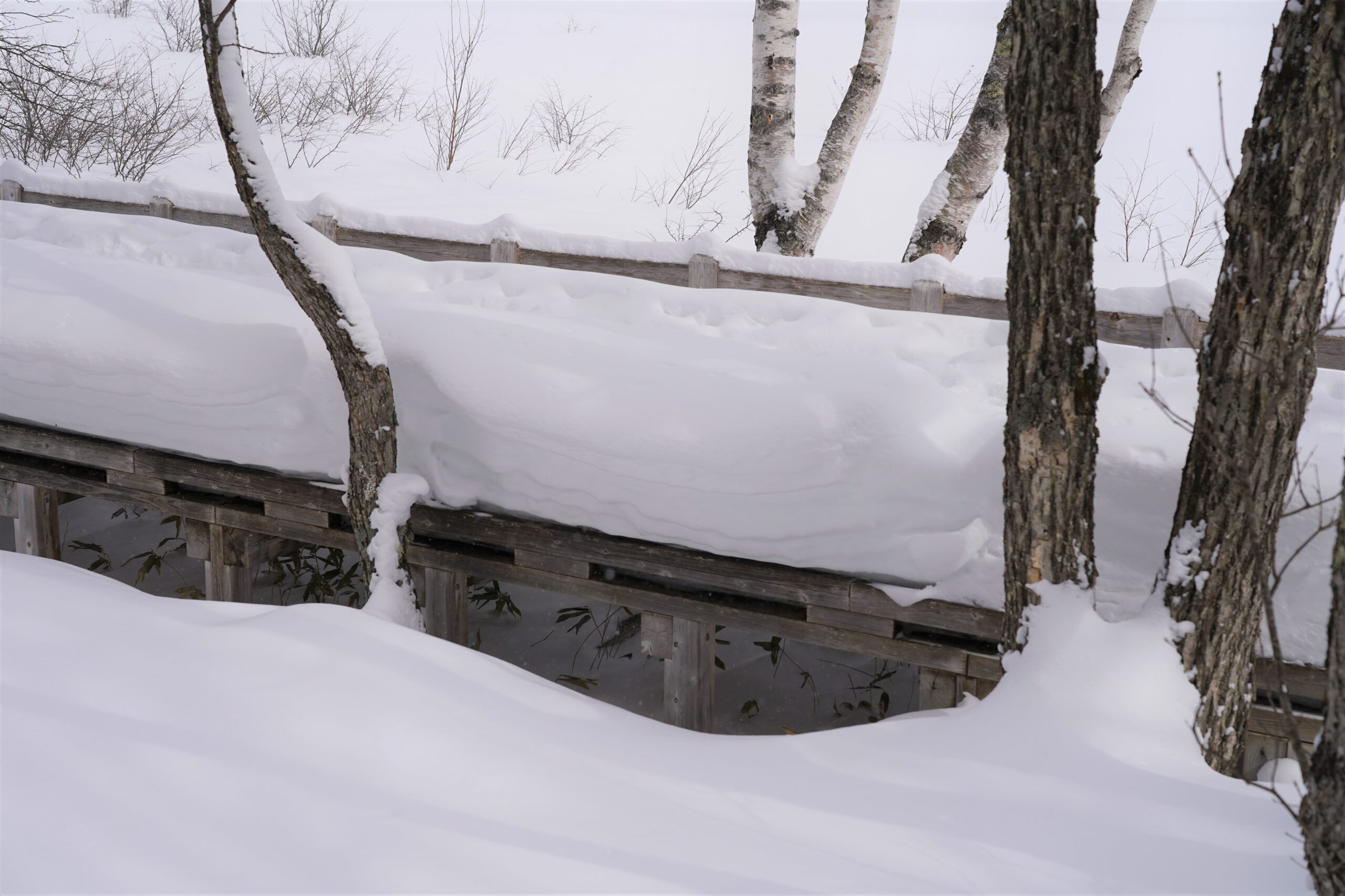 場所によっては雪が吹き溜まり、踏み跡どころか木道すらほぼ消失してしまっています。