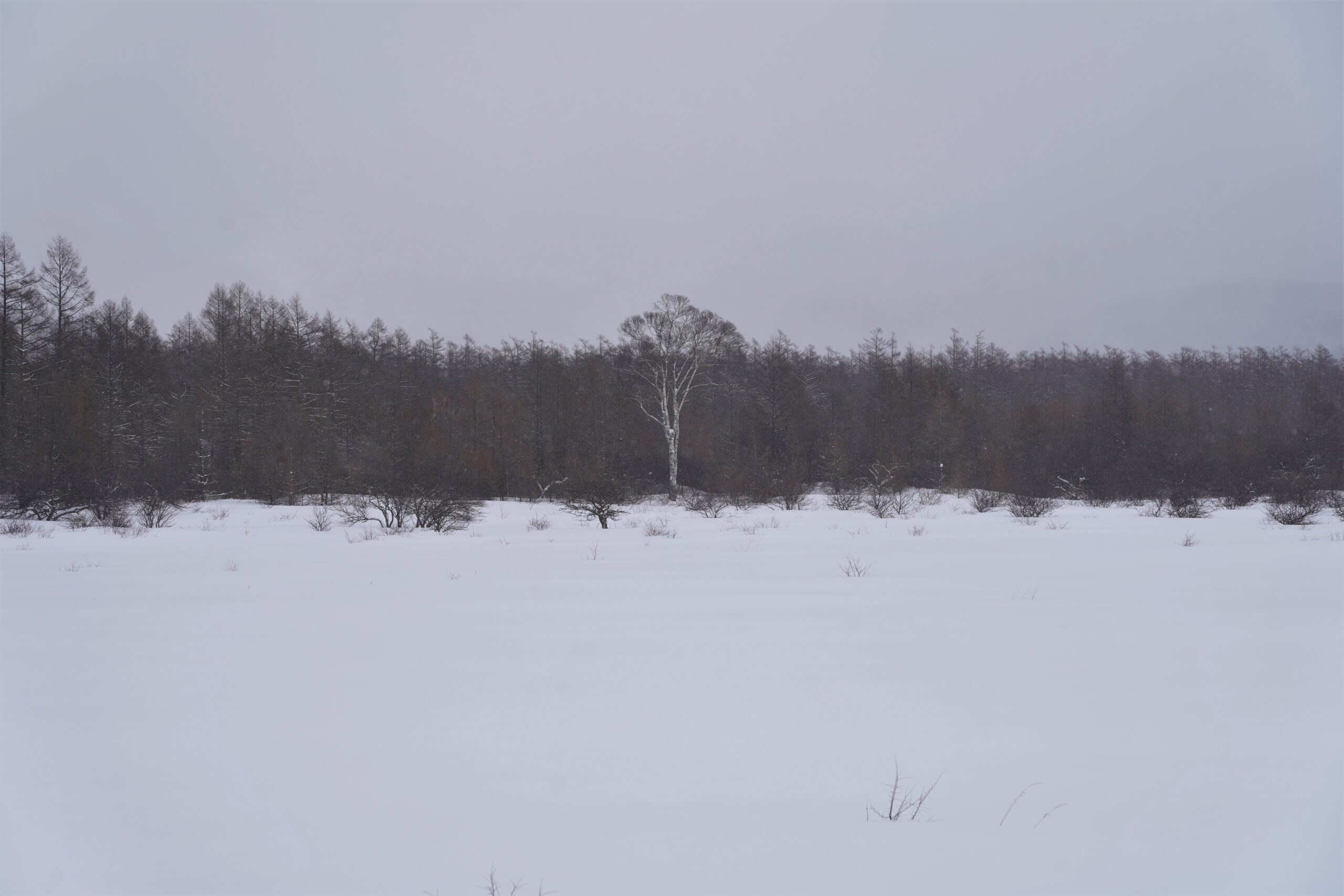 積雪により真っ白になった湿原に、ひと際大きなシラカンバ「貴婦人」の姿が非常によく映えます。