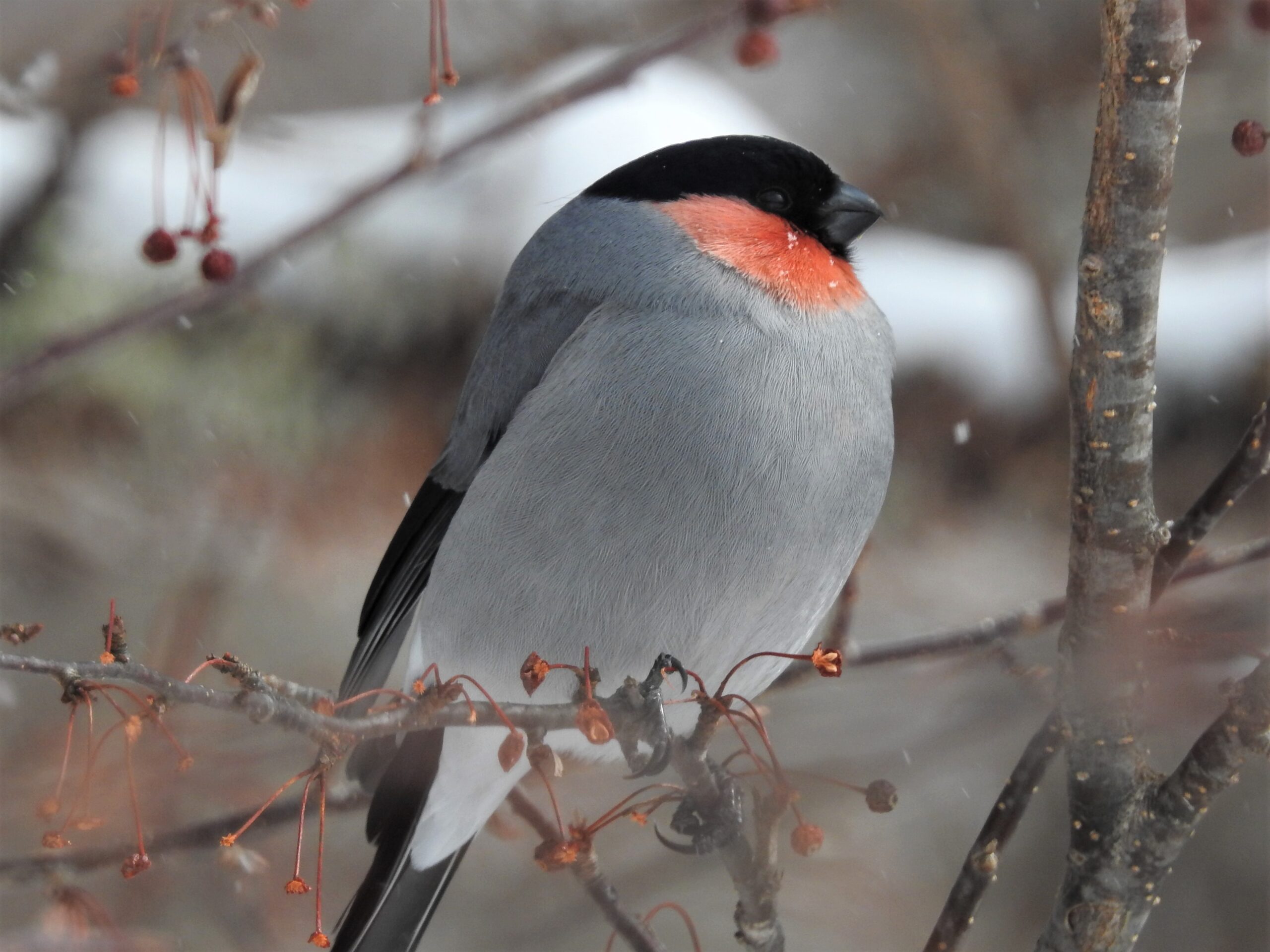 奥日光では一年中見ることが出来るウソですが、この紅色が雪景色に映える冬にこそぜひ出会いたい野鳥です。