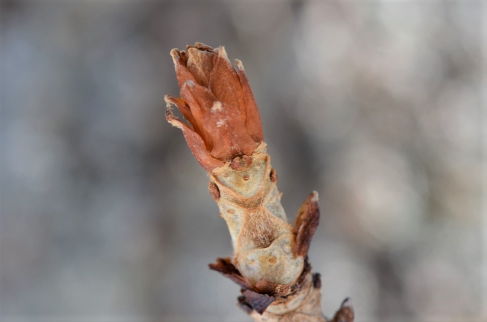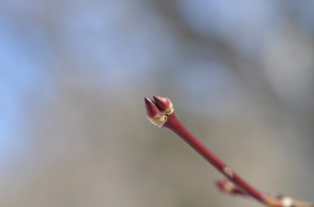 枝先に二つの冬芽が並んでいてまるでシカの蹄みたい!外側は固く、つやのある赤い色をしていてとても綺麗ですね。