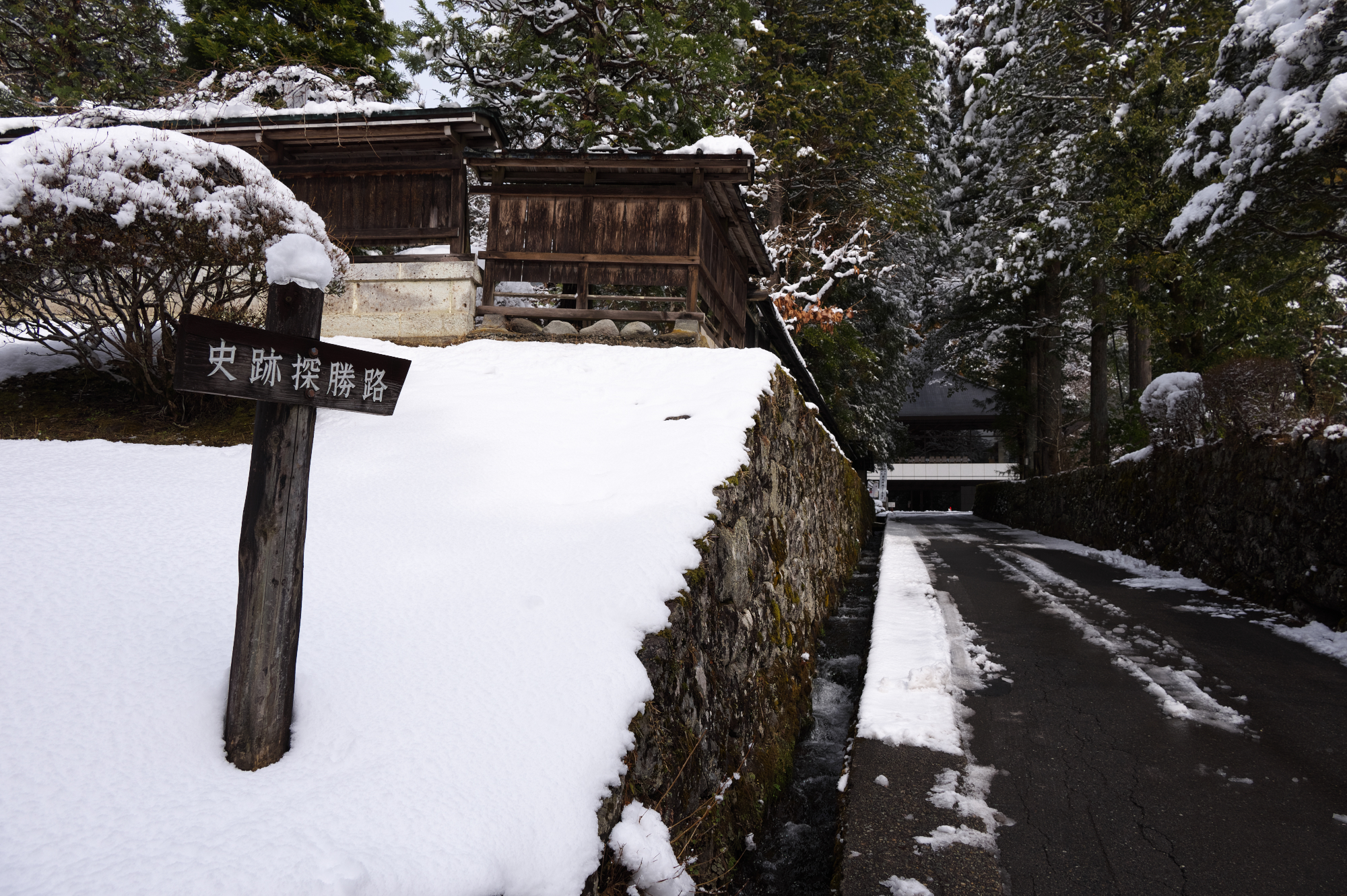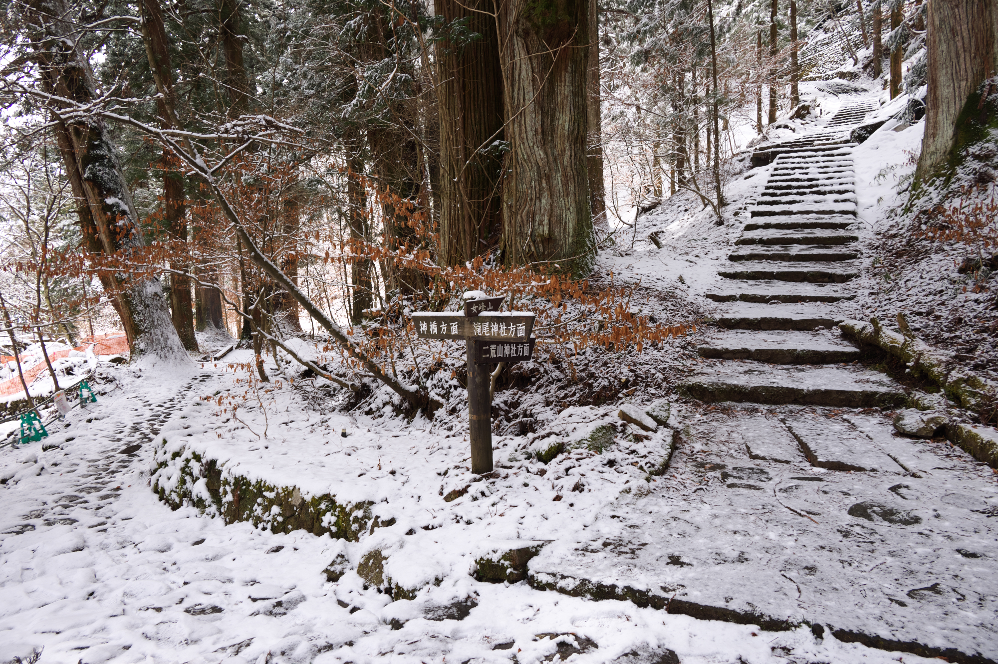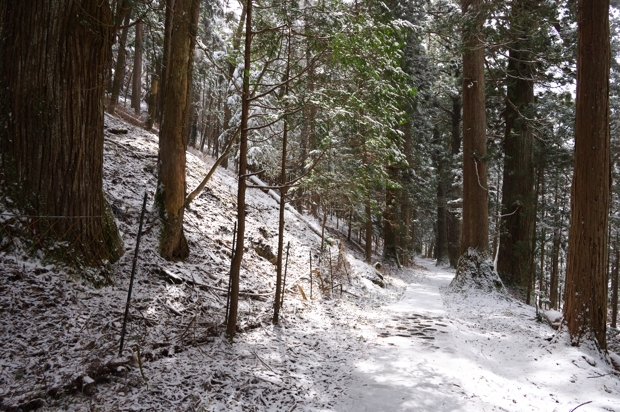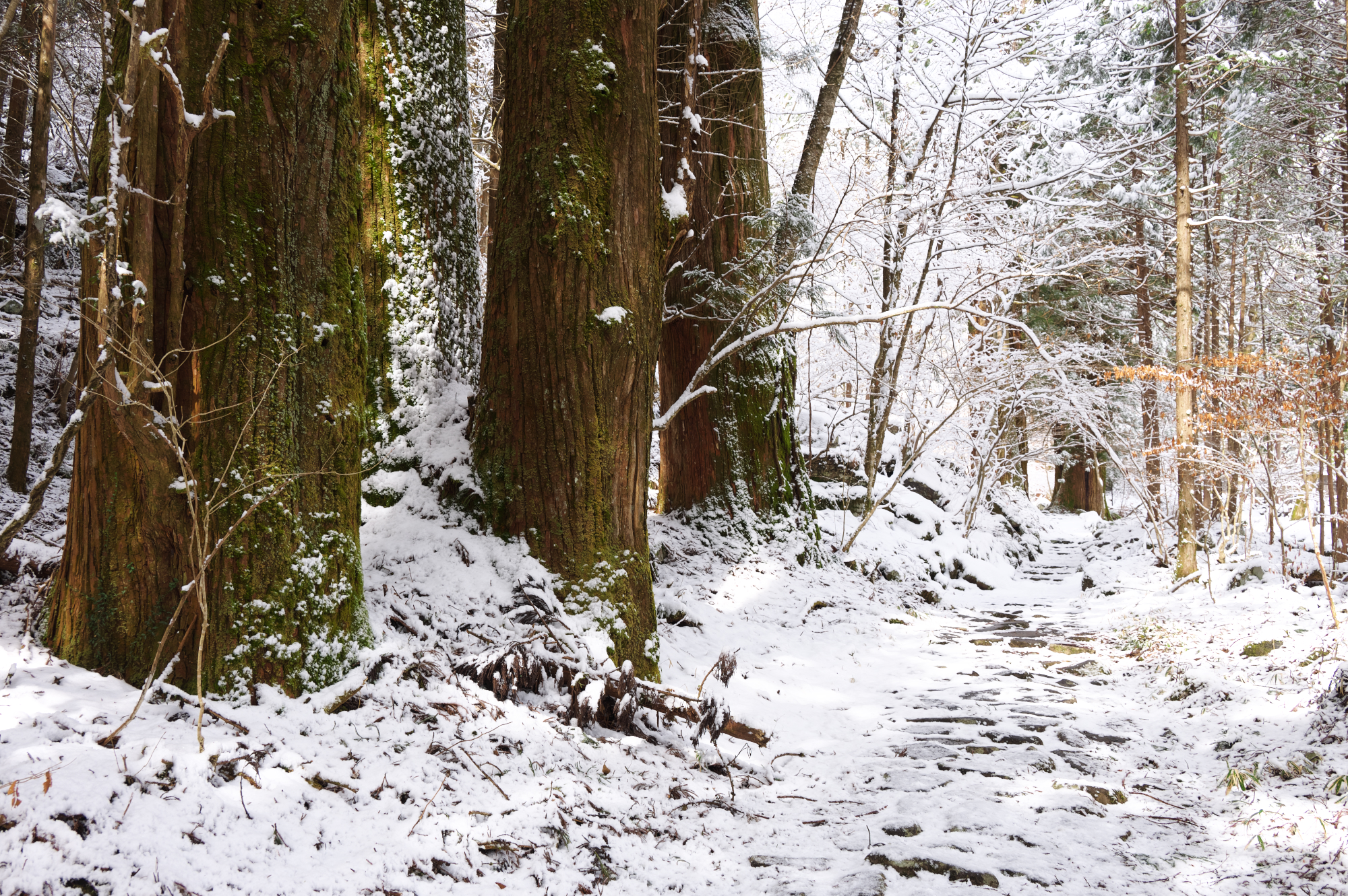 人の何世代もの時代を見てきたであろう巨大な杉に囲まれた森の中と考えるとそれだけで神秘的ですが、雪景色が相まってさらに幻想的。