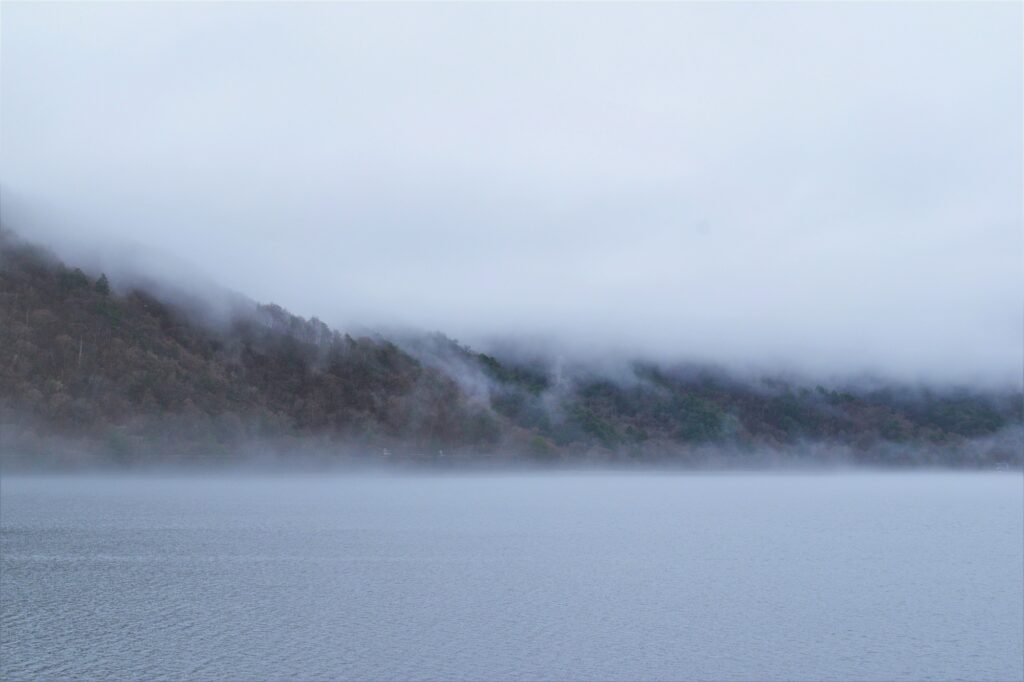 男体山や白根山は雲の中でしたが、湖面と山に絡む霧がとてもきれいでした。