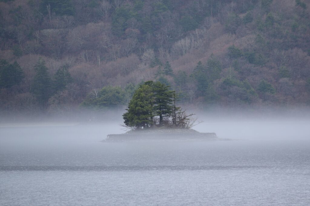 こちらは中禅寺湖唯一の島、上野島(こうずけじま)です。こちらも湖面の霧でとても神秘的になっていました。