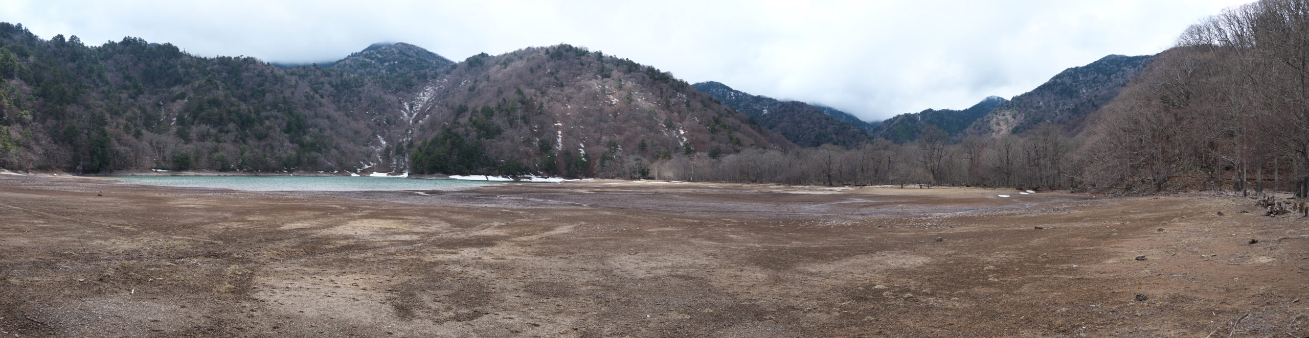 西ノ湖は対岸にまだ雪があり、水量は奥の深くなっているところに溜まっている状態で非常に少ないです。