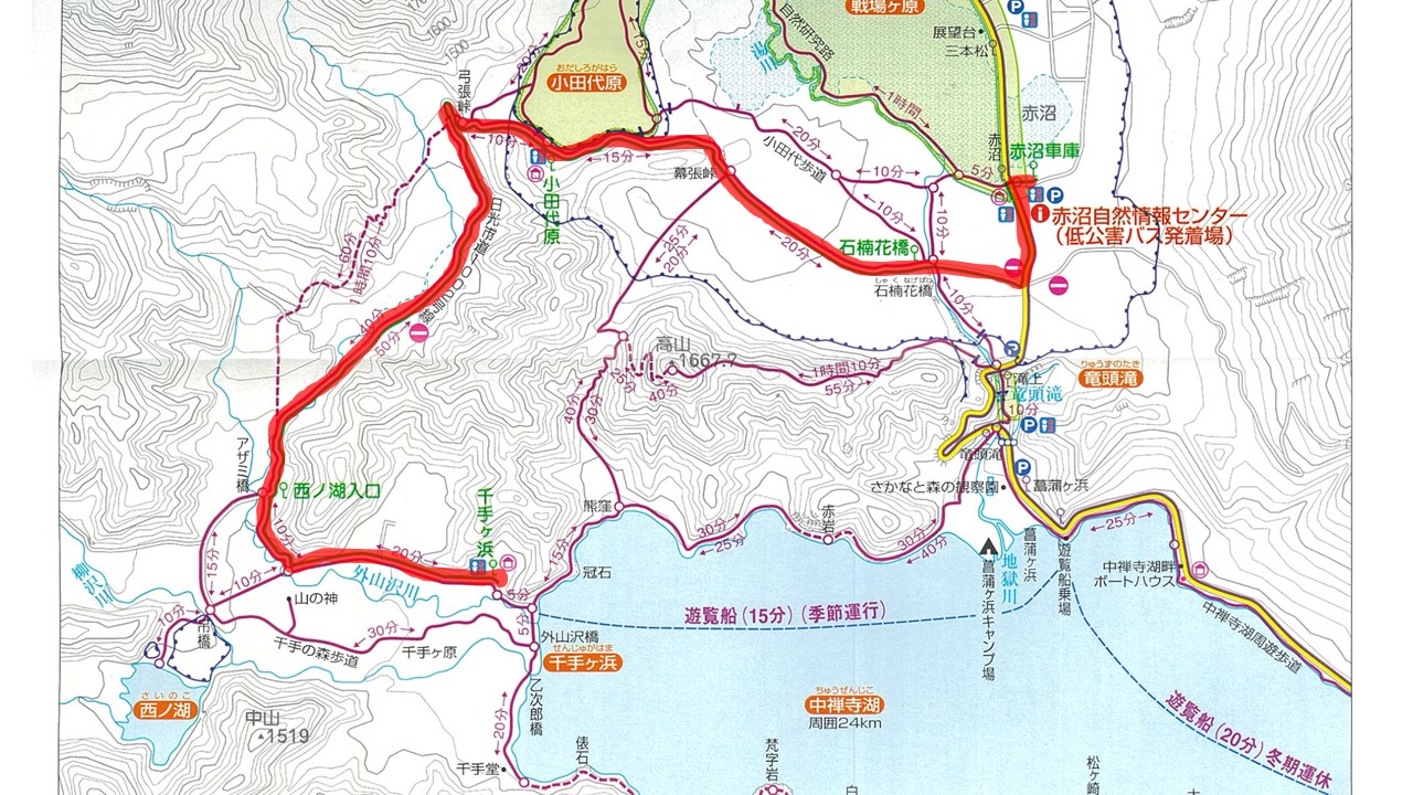 まず、低公害バスは赤沼車庫を出発して千手ヶ浜までの1002号線(赤色のマーカー部分)を往復します。