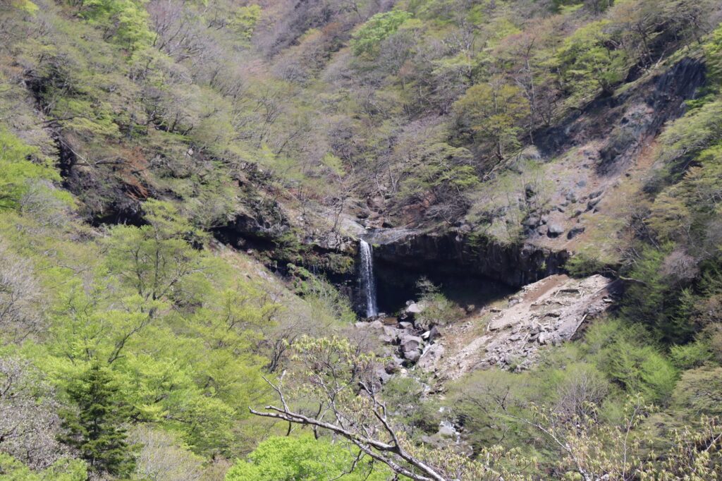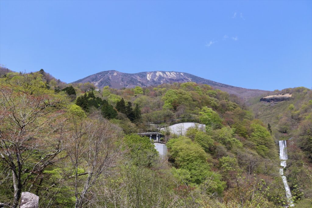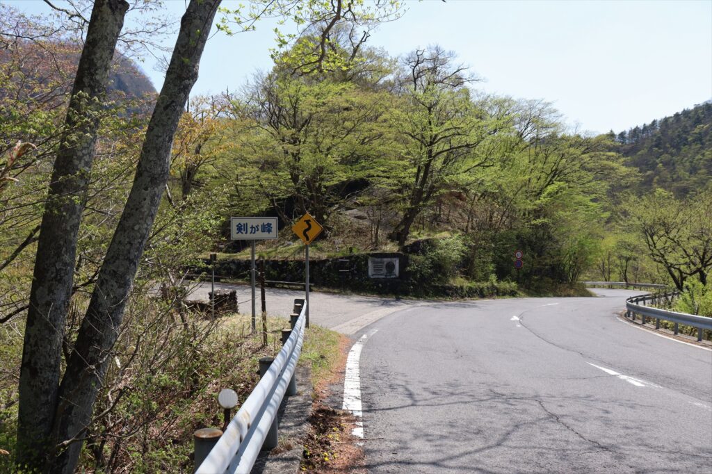 「剣ヶ峰」です!下りのいろは坂で唯一車を3台ほど止められる場所なんですが、剣ヶ峰からは新緑と二つの滝をセットで眺めることができるんです。